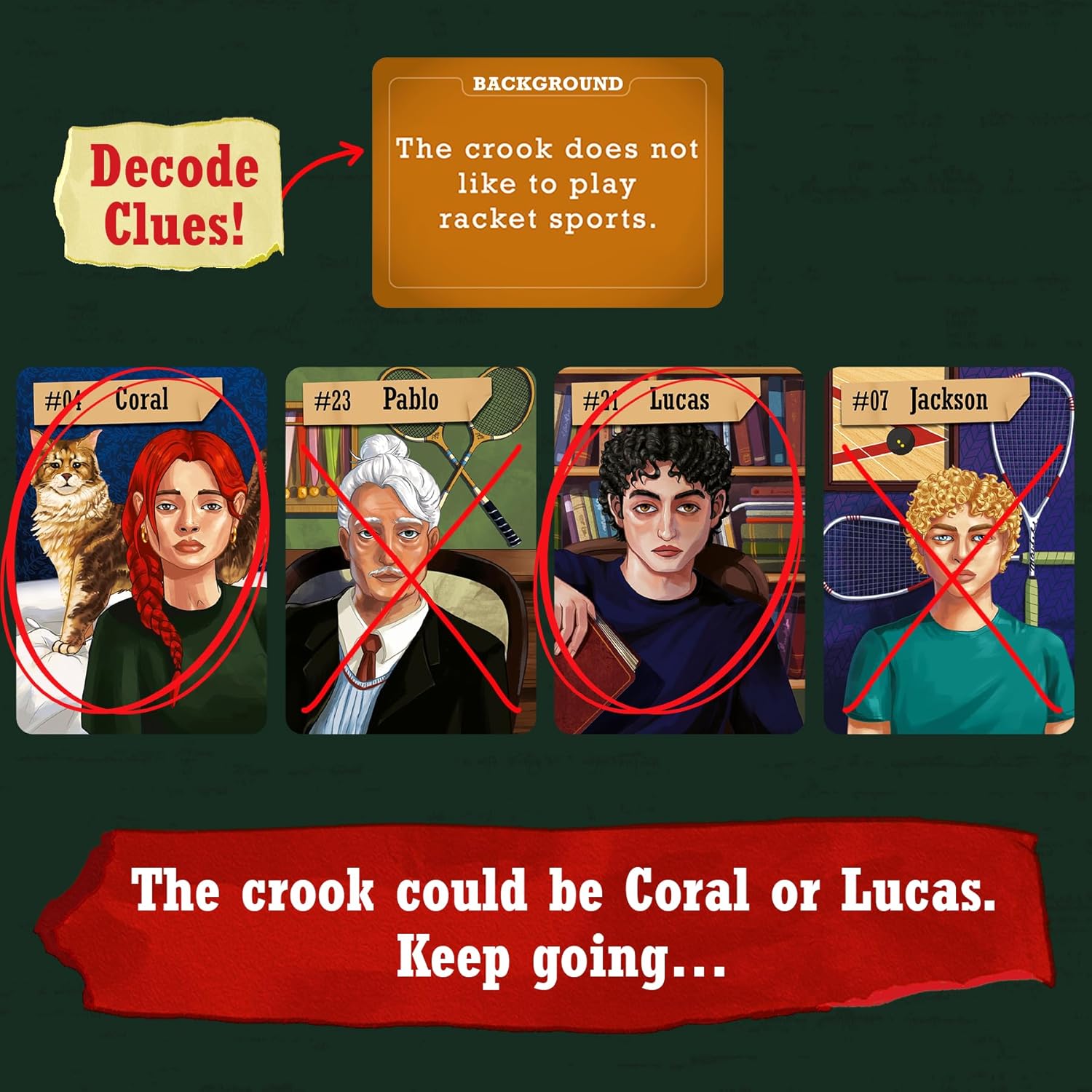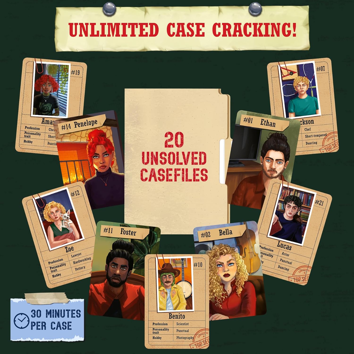 UNLOCK SECRETS WITH CLUE CARDS: In a game where every character has something to hide, clue cards help you uncover secrets faster, speeding up your investigation!