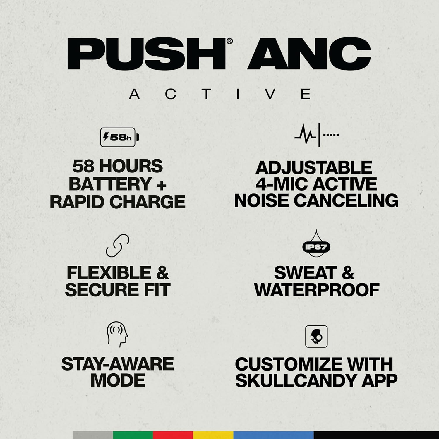 Push ANC Active is our zero-compromise active earbud for the athlete who doesn’t hold back. This is the bud with every active feature — including comfortable, low-profile ear hangers, fully waterproof construction, adjustable Stay-Aware Mode and 4-Mic Active Noise Canceling to get you in the zone.