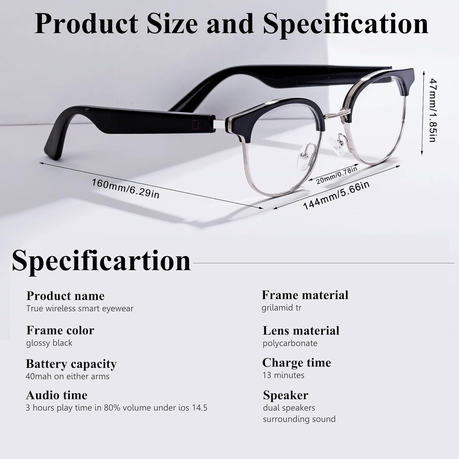 Dual Stereo Speaker & Open-Ear Sound Experience ▶ Our Smart Listening Glasses are designed with an open-ear speaker, let you say goodbye to the discomfort of wearing headphones for a long time, immersive sound to the space around your ears.