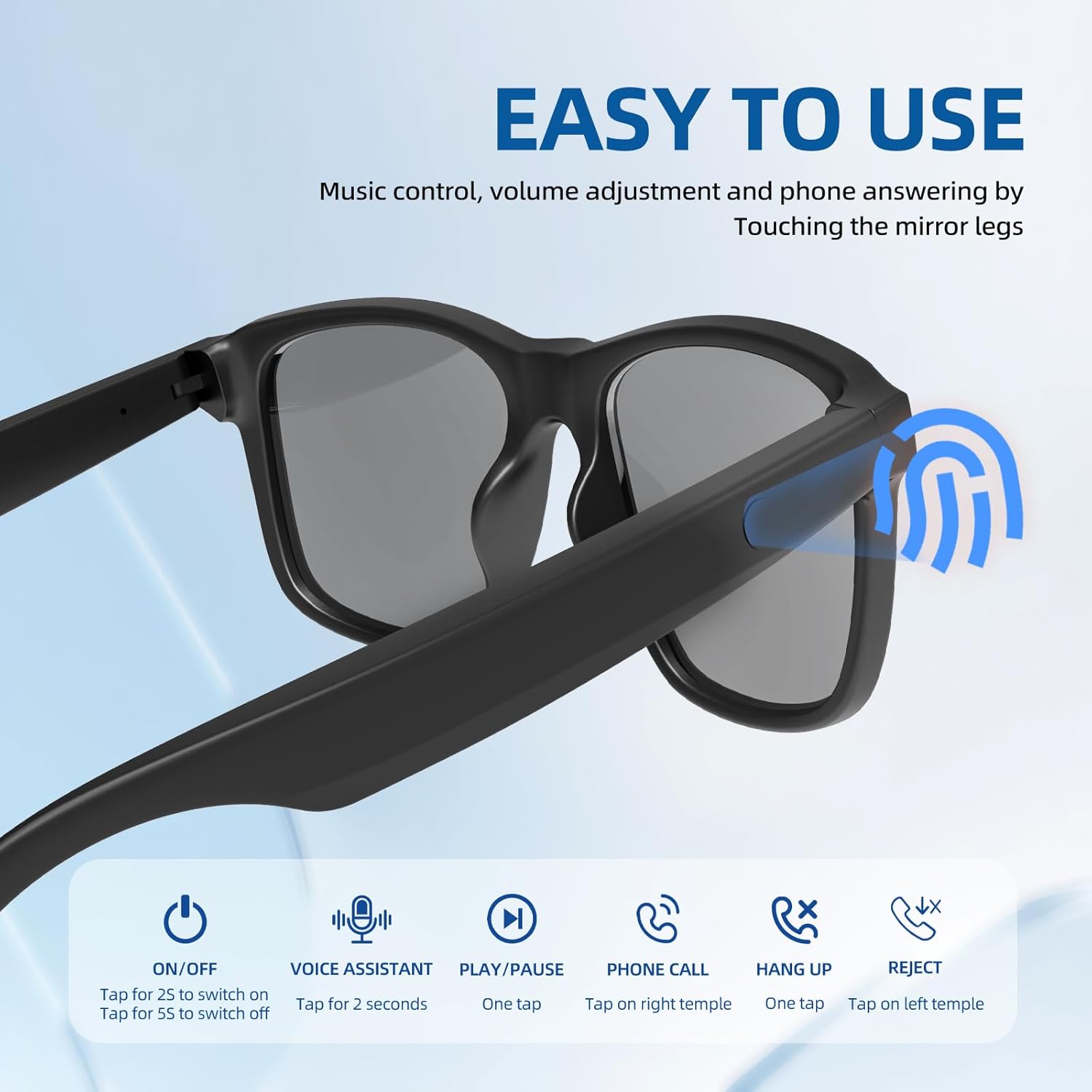 The frame of these smart Bluetooth glasses is constructed from durable polycarbonate material and weighs just 30 grams. Enjoy comfort and style akin to regular sunglasses, all without compromising on quality!