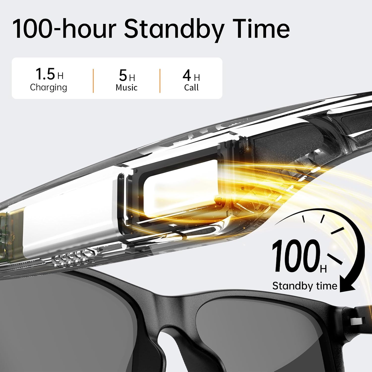 【𝟏𝟎𝟎 𝐇𝐨𝐮𝐫𝐬 𝐋𝐨𝐧𝐠 𝐒𝐭𝐚𝐧𝐝𝐛𝐲 𝐓𝐢𝐦𝐞】Smart sunglasses Bluetooth high-quality battery after 500 times test and ultra-long standby 100 hours test, a charge can enjoy up to 4 hours of talk time and 5 hours of music playback time, built-in 80mah/3. 7V to meet the needs of daily use, this Bluetooth sunglasses is designed for daily use.