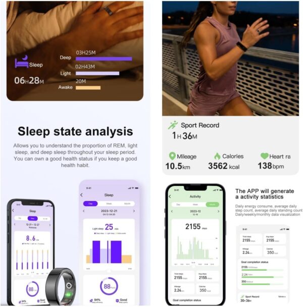 【Smart Sleep Analysis】Real-time monitoring of sleep movement, and transmission and recording in the App, including sleep duration, deep sleep duration, light sleep duration, awakening duration, etc., bringing you better sleep suggestions!