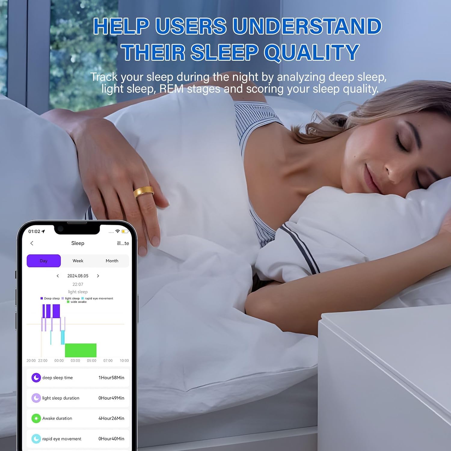 【Sleep Tracker Monitoring】The Sleep Tracker Ring can comprehensively record your sleep cycle, including light sleep, deep sleep and REM stages, to help you understand your sleeping habits. We recommend that you wear the smart ring for more than 3 days in a row, because the smart ring needs some time to adapt to your wearing habits to accurately capture your body data.