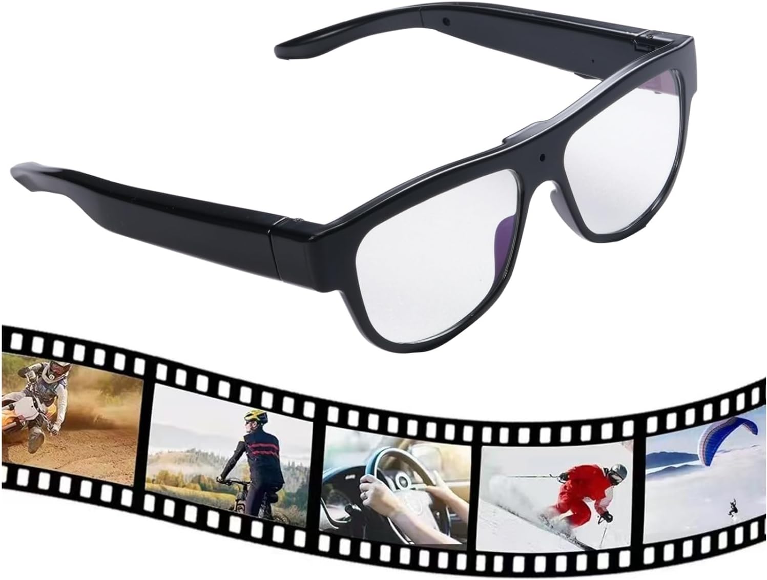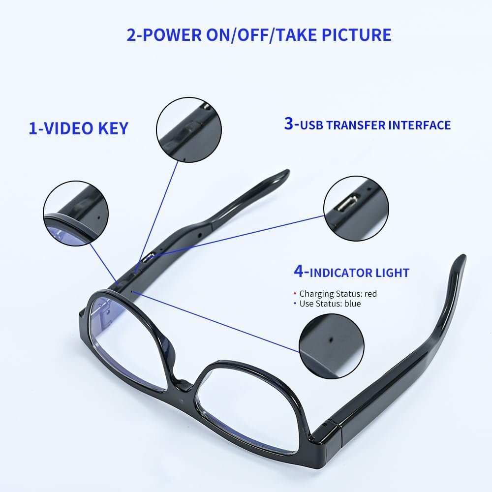 Full HD 1080P Mini Camera: The built-in camera records at 1080p and 30fps. The camera lens is located in the middle of the glasses. The camera glasses is suitable for different scenes, you can wear th glasses camera to record any import moments such as cycling, hiking, camping, and class.