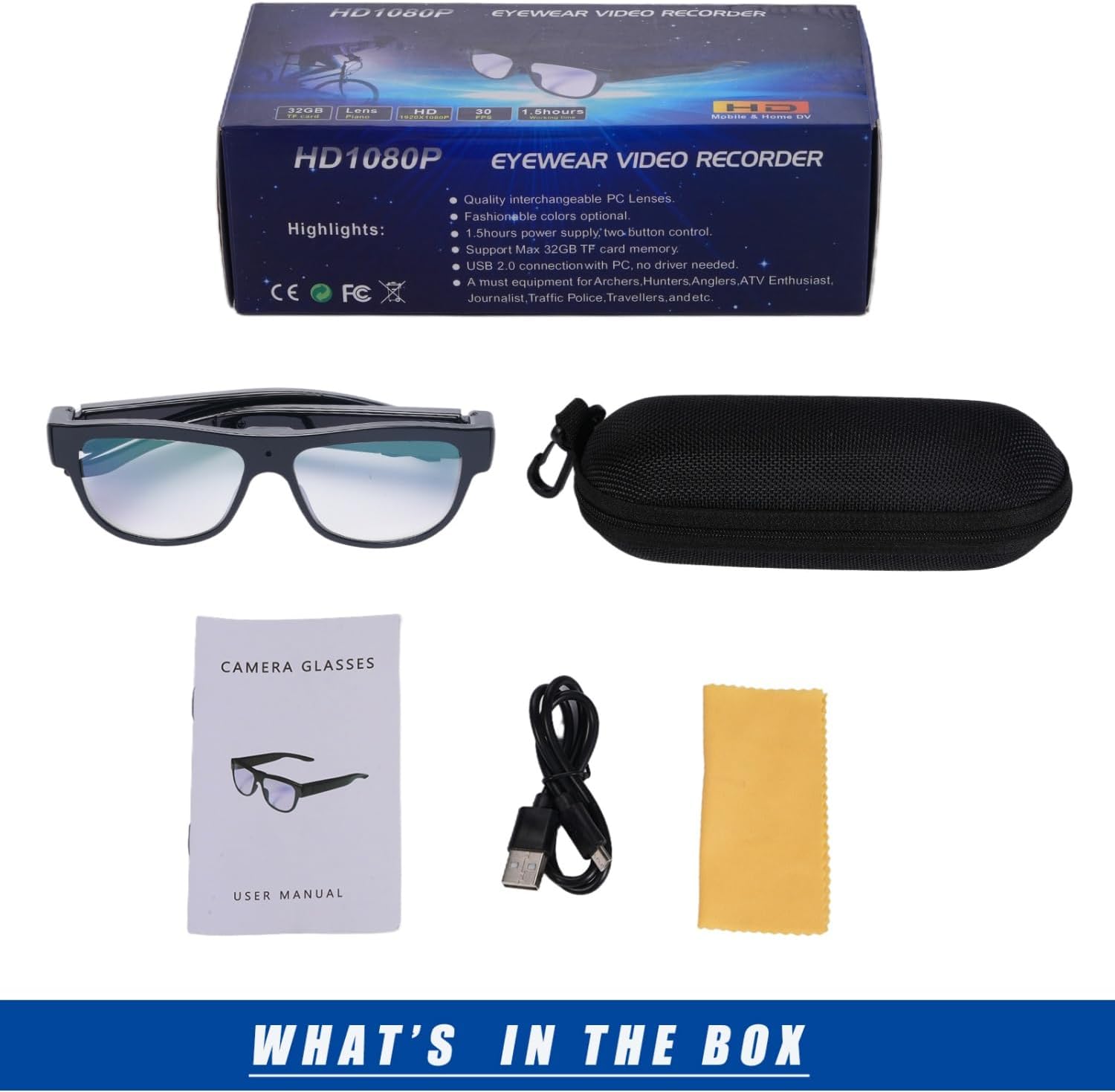 What you will get: 1 x camera glasses, 1 x black box, 1 x cleaning cloth, 1 x USB data cable, 1 x User manual. We also provide 24/7 after sales service, you are free to contact us if you have any question about the product. Non-professional camera pixels, no anti-shake function, please consider carefully before purchase.