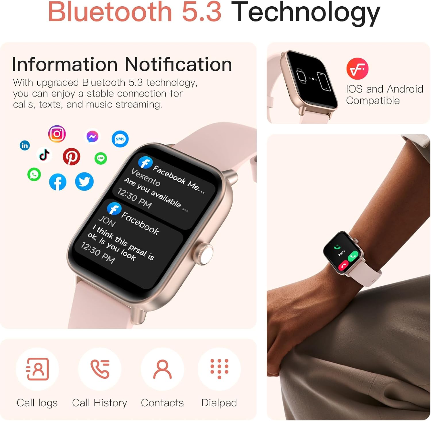 Make Answer Calls and Read Message: Trunsif smart watch equipped with built-in HD speaker, compatible with iPhone and Android phones, connecting to the smartphone via Bluetooth, so you can directly use the smartwatch to answer or make calls. It supports various intelligent reminders, including text, social network messages (Facebook, WhatsApp, Instagram, Twitter, etc.), daily reminders, and more