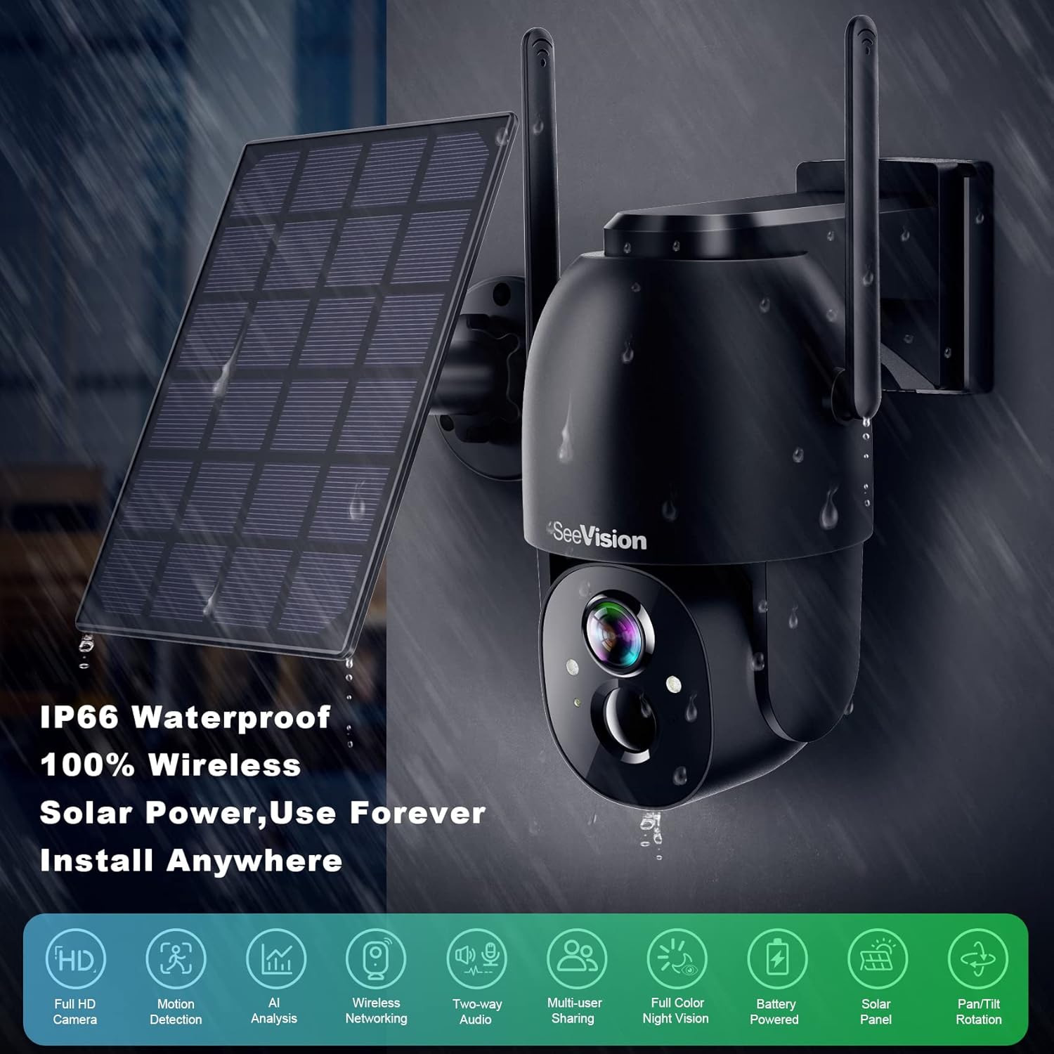 【Solar Powered, Rechargeable, Waterproof and Wire-Free】This solar security cameras wireless outdoor/indoor camera has a 9000mah battery built in to provide continuous power for wireless outside cameras with high conversion rate solar panels.The wifi security camera outdoor with IP66 waterproof can work in any weather.Since the WIFI cam is completely wireless,no power cords or network cable is needed, the installation is very simple,allowing install anywhere though the provided,bracket and screw.