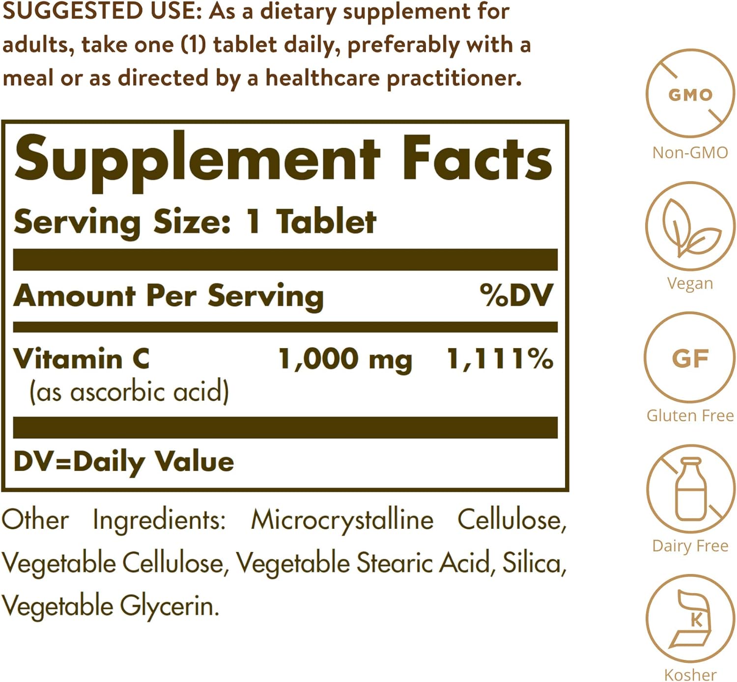 Non-GMO & Gluten Free; Solgar Vitamin C 1000 mg Tablets are non-GMO, kosher, and suitable for vegans; Free of: gluten, wheat, dairy, soy, yeast, sugar, sodium, artificial flavor and sweetener