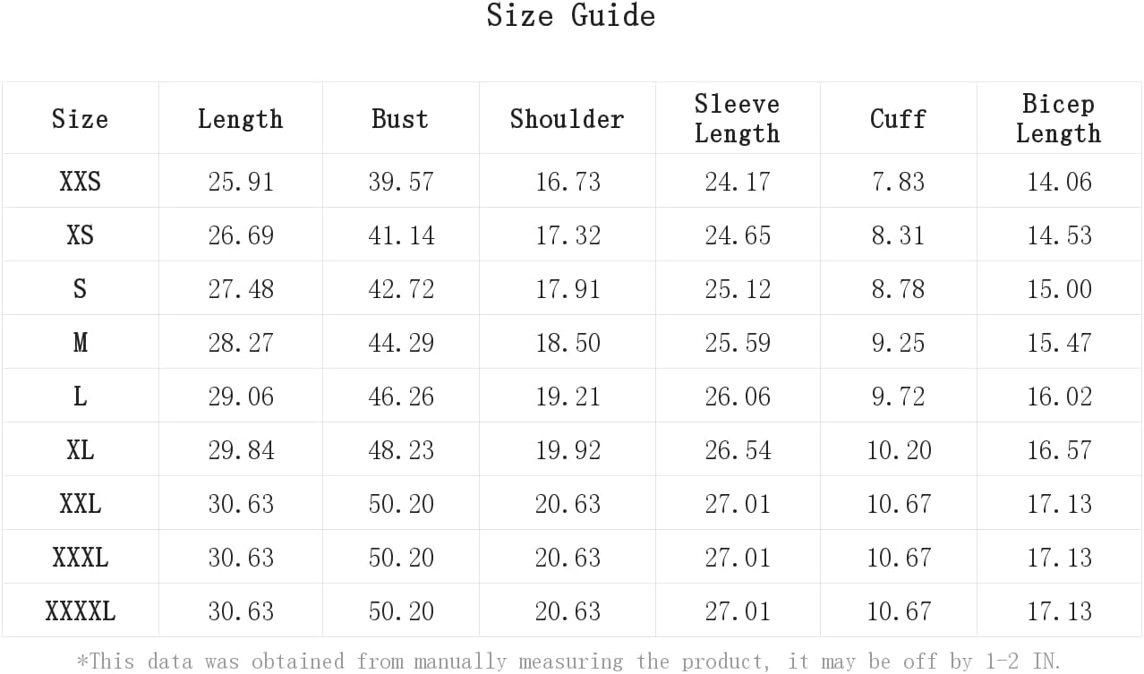 XXL:Bicep Length:17.1IN,Bust:50.2IN,Cuff:10.7IN,Length:30.6IN,Shoulder:20.6IN,Sleeve Length:27.0IN