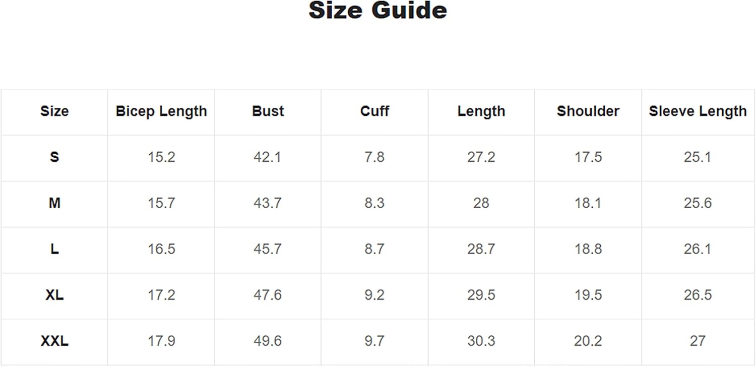 X-Large: Bicep Length: 17.2″, Bust: 47.6″, Cuff: 9.2″, Length: 29.5″, Shoulder: 19.5″, Sleeve Length: 26.5″,