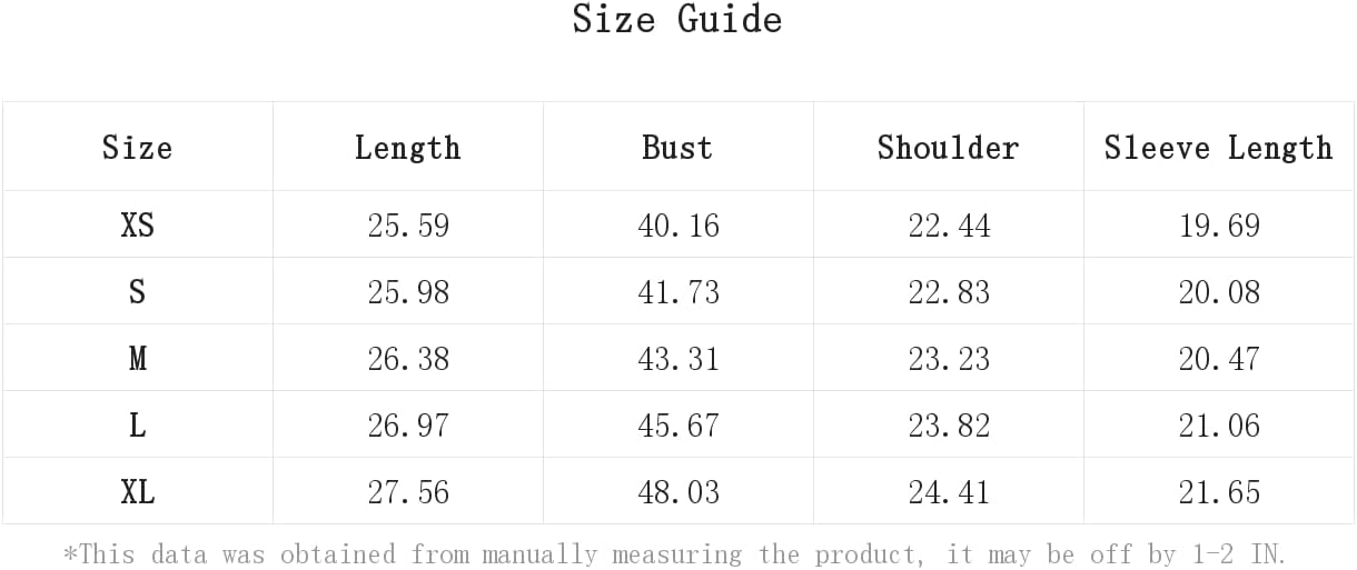 XS:Bust:40.2IN,Length:25.6IN,Shoulder:22.4IN,Sleeve Length:19.7IN