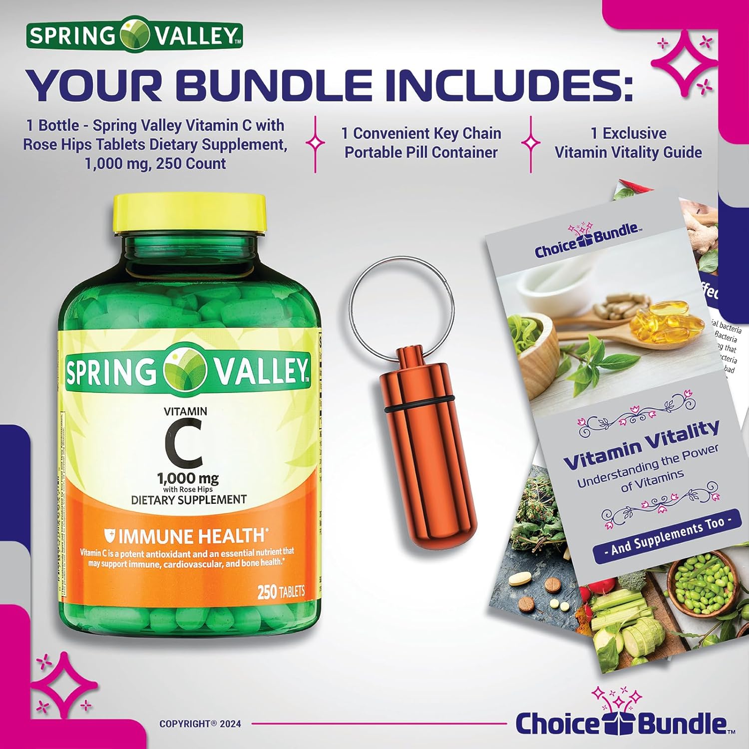 Spring Valley Vitamin C with Rose HIPS Tablets Dietary Supplement 1,000 mg, 250 ct Choice Bundle + Vitamin Vitality Guide & Portable Pill Container (3 Items)!