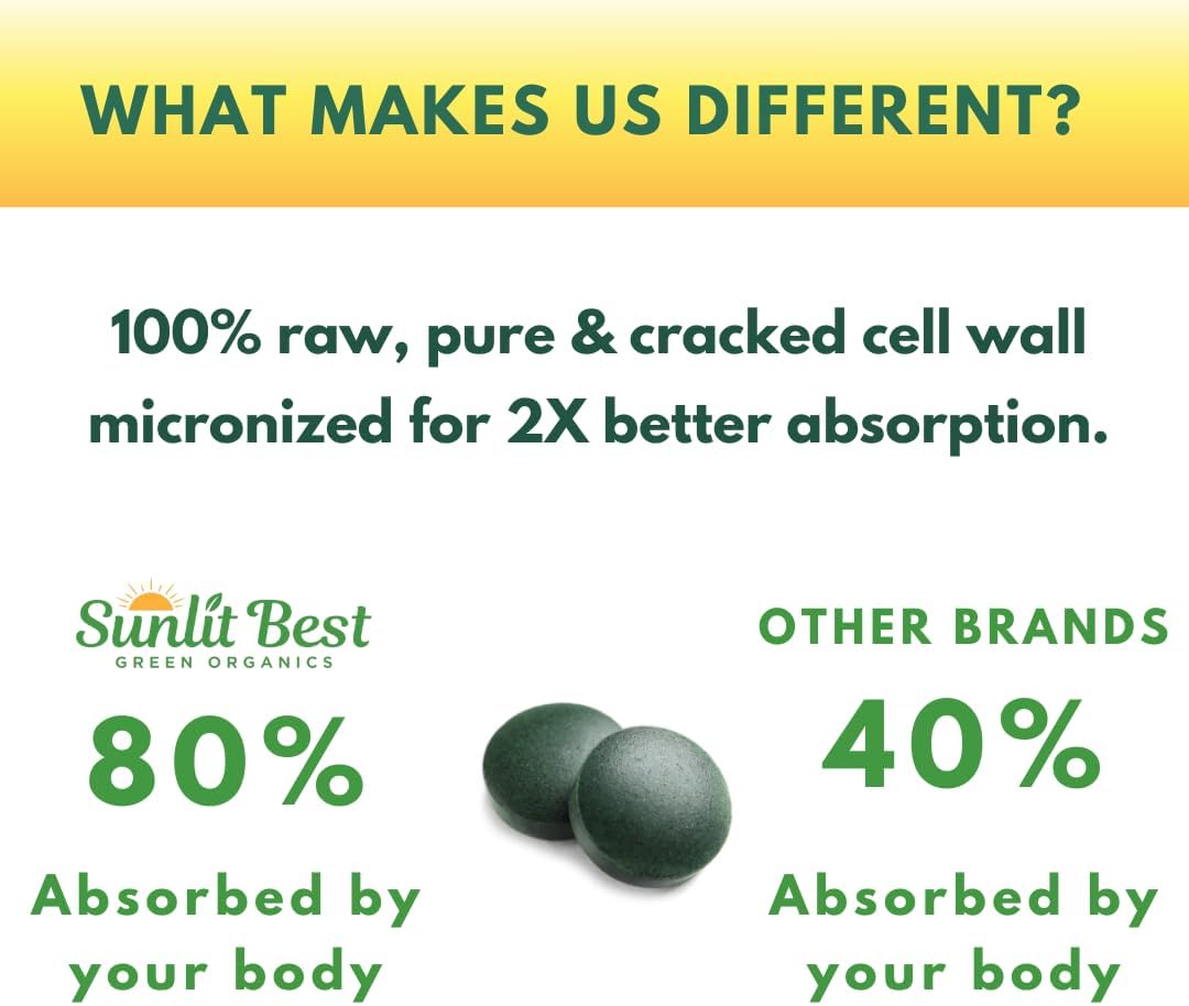 EXTREMELY NUTRITIOUS CRACKED CELL WALL: This nutrient-dense superfood is made up of 60% plant protein & amino acids, and is rich in essential nutrients, including chlorophyll, fiber, antioxidants, enzymes, minerals & vitamins, including vitamin A, B1, B2, B6, B12, C, E, potassium, iron & calcium. The micro blue green algae cell walls are cracked open using our patented proprietary low-pressure technology, making Sunlit Best Chlorella twice as absorbable for your body than most other brands.