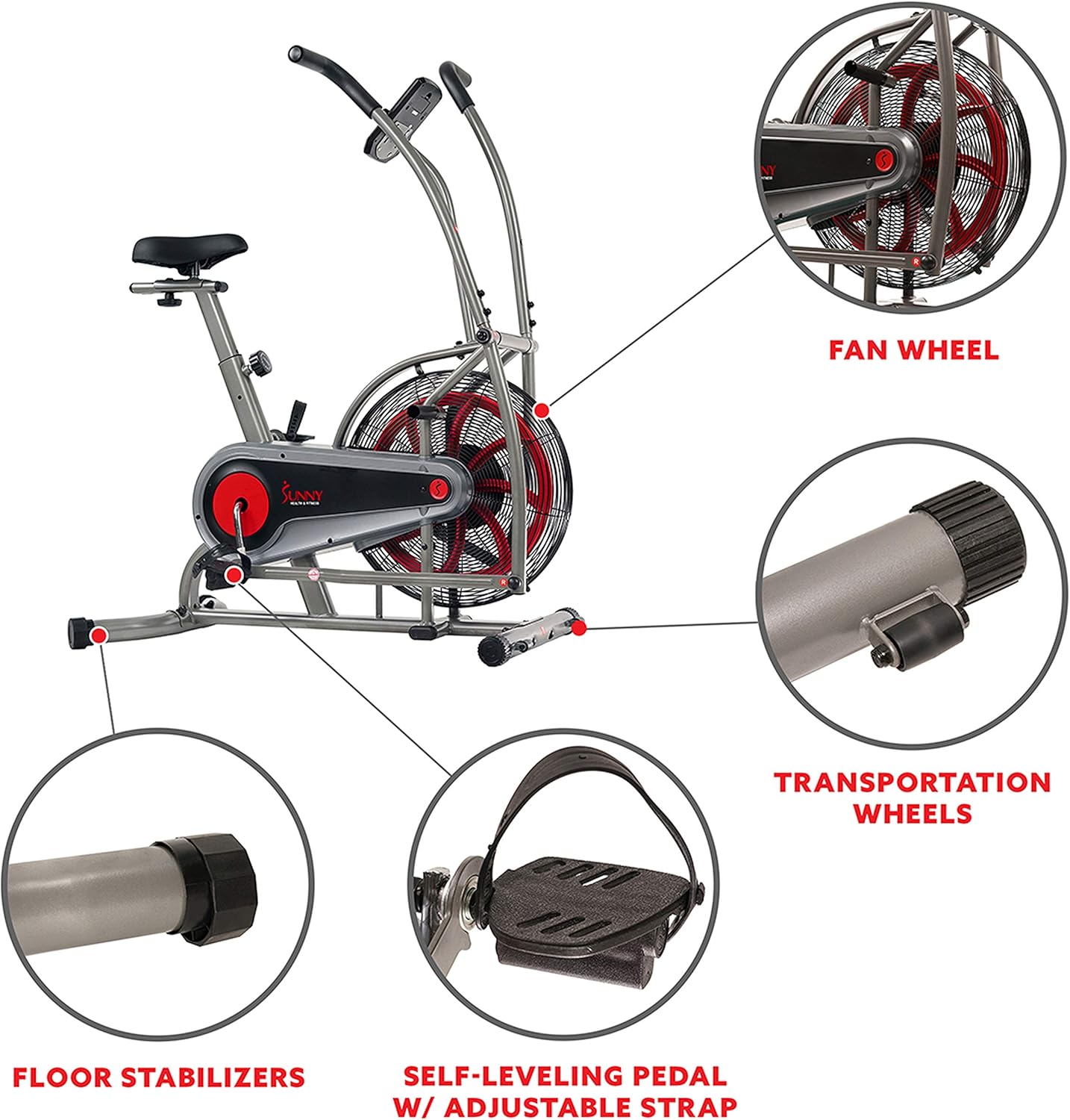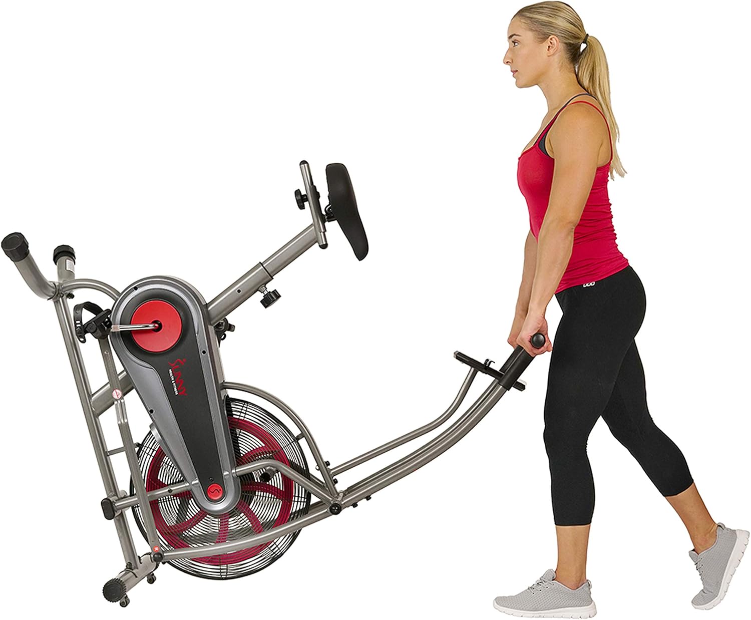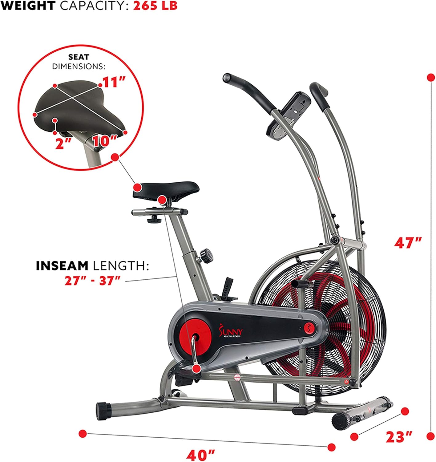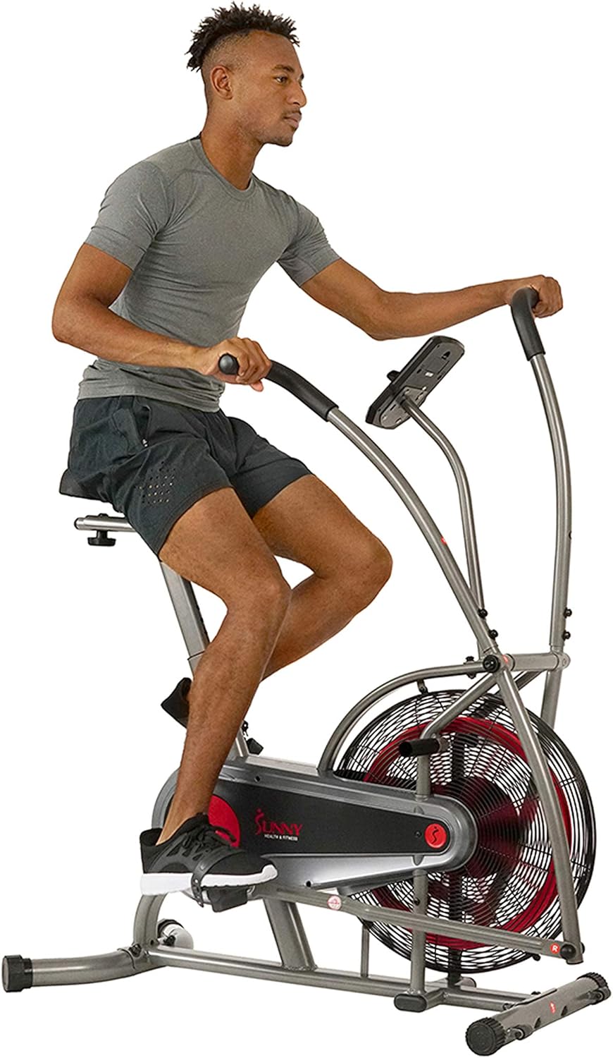 Build endurance and stamina with the SF-B2715 Zephyr Air Bike by Sunny Health and Fitness. Air resistance technology creates higher resistance making this workout machine low impact yet, completely intense. Achieve a full-body workout when utilizing the arm resistance handlebars while cycling. Track all of your fitness results on the digital monitor. Experience superior comfort on the Zephyr Bike with features that include: padded seating, adjustable seat and pedals, and rubber foam handles. The bike measures at a convenient 44L X 24W X 45H (inches). Achieve an incredible workout on The Zephyr Air Bike: the bike built to take punishment.