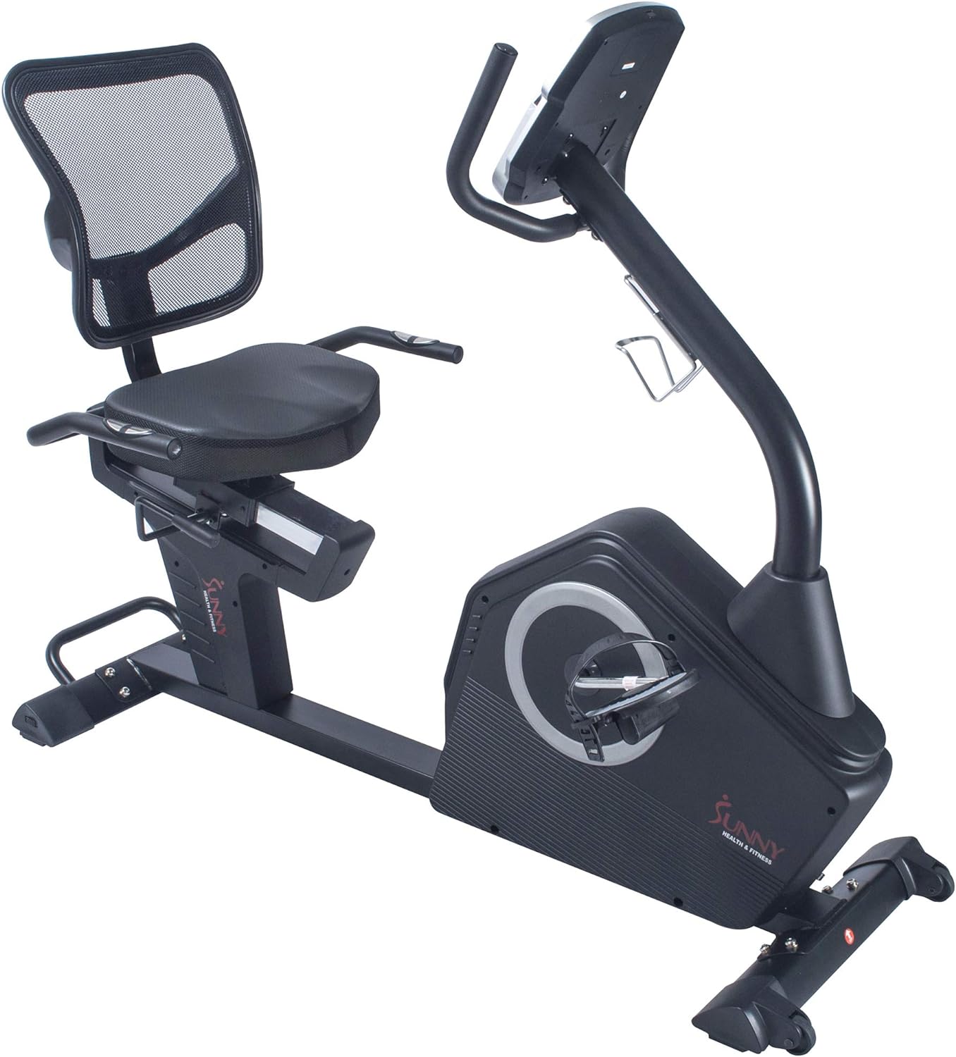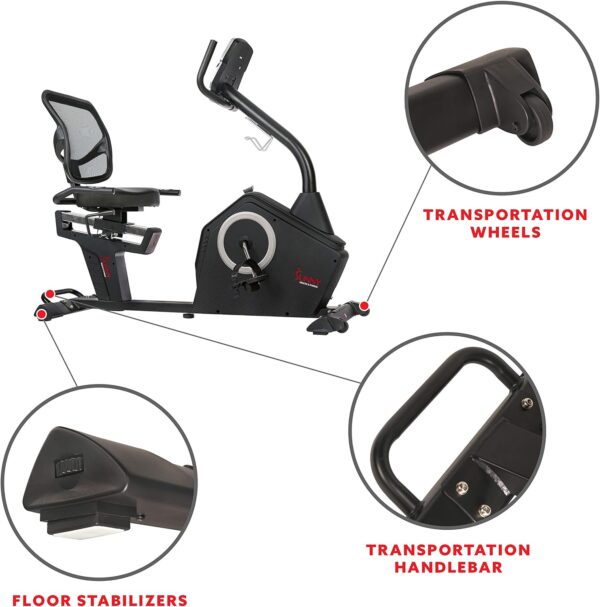 【 CONVENIENCE FEATURES: THIS SUNNY RECUMBENT BIKE 】includes a device holder, water bottle holder, adjustable ground levelers, and transportation wheels for enhanced mobility and stability, making it a convenient addition to your home fitness equipment.