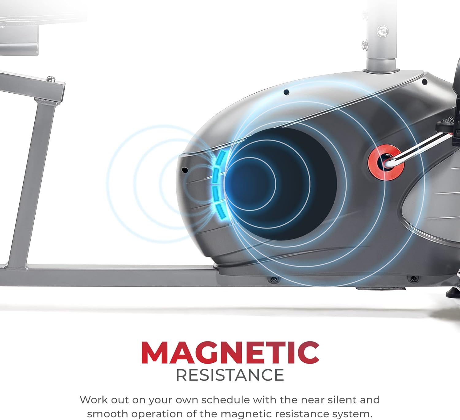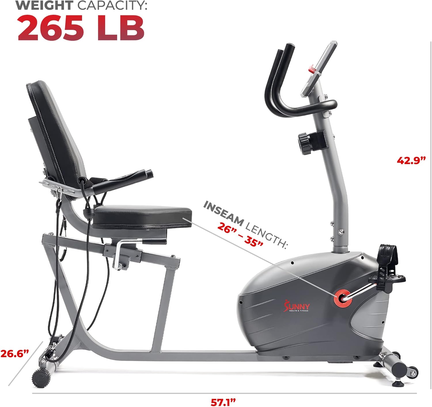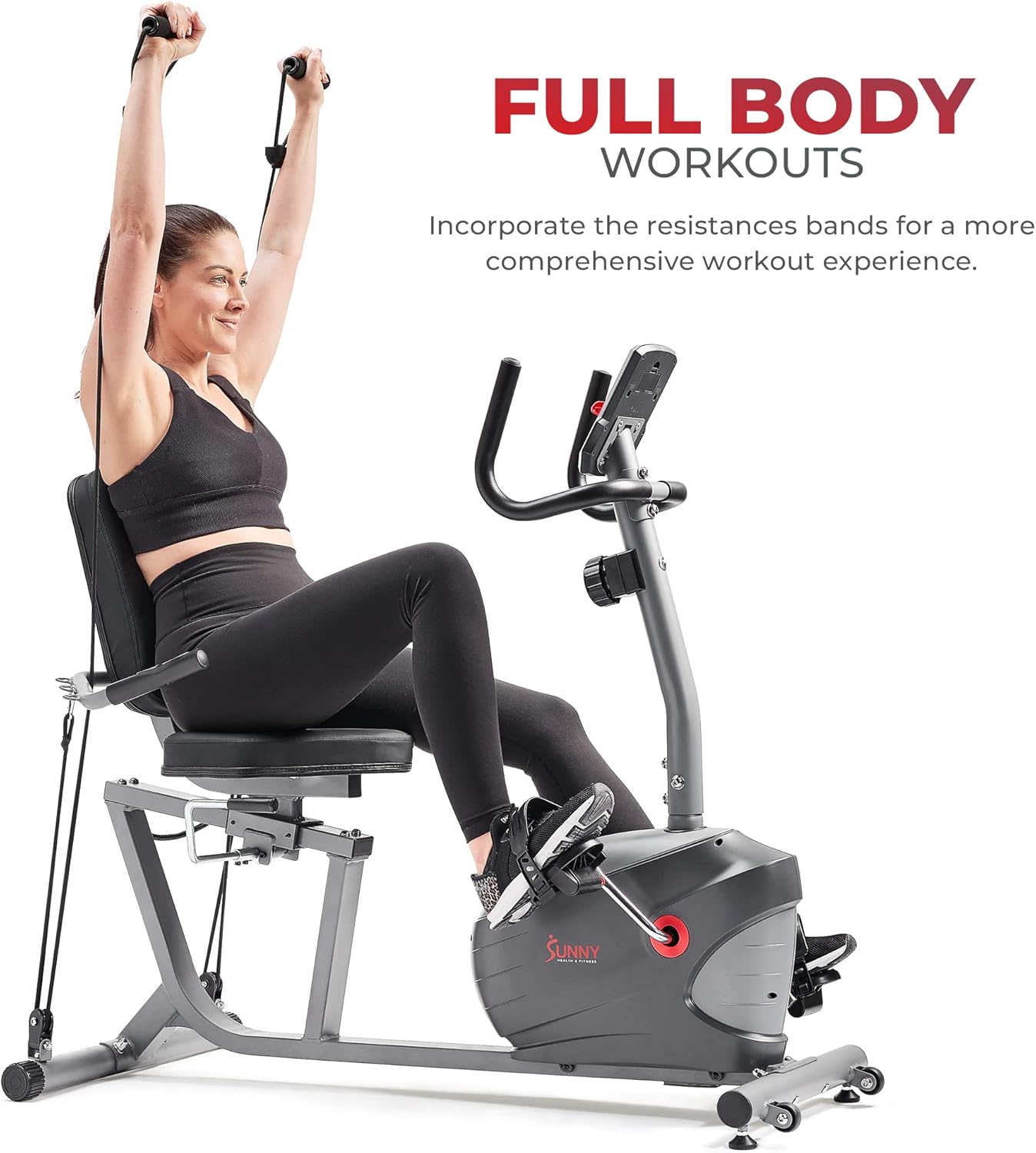 Let Sunny Health and Fitness keep your workouts on track with the SF-RB4631 Recumbent Bike with Arm Exerciser. This versatile and reliable recumbent bike with arm exerciser has a large seat and back cushion with adjustable height for users and various sizes. Control your workout intensity with 8 levels of magnetic resistance. Keep track of workouts with the integrated digital monitor. Monitor tracks: Time, count, total count, calories and count per minute. Also contains handle bars with dual position handle grips and built in transportation wheels for easy portability. Self-leveling foot pedals