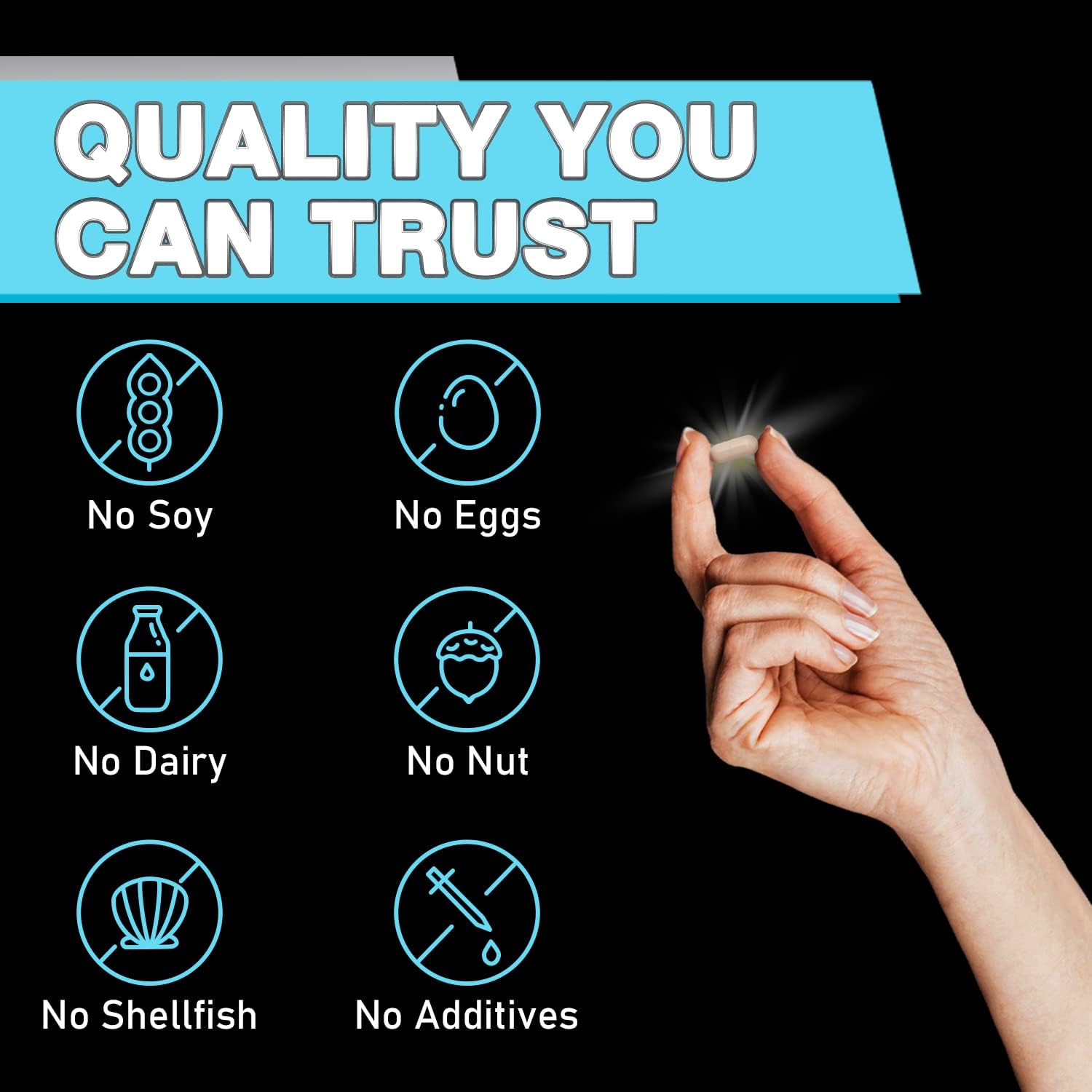 No GMOs, artificial ingredients, fillers, soy, gluten, dairy, egg, shellfish, fish, wheat, tree nuts, and peanuts.
