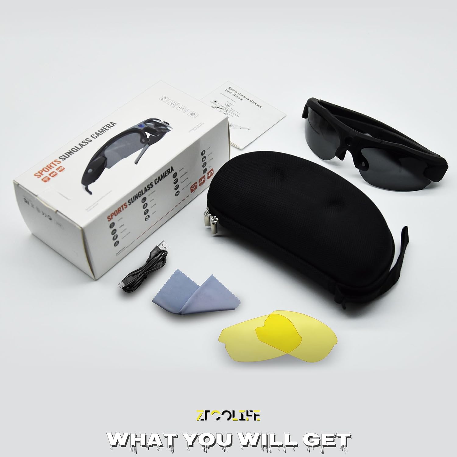 You Will Get: The package includes the ZTCOLIFE camera glasses, USB cable, interchangeable yellow lenses, glasses hard case, lens cloth and a user manual. Everything you need to get started is included.