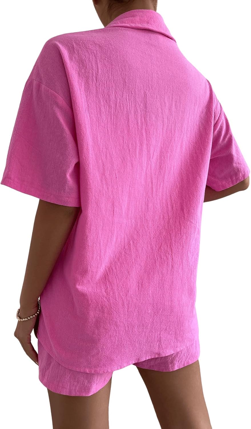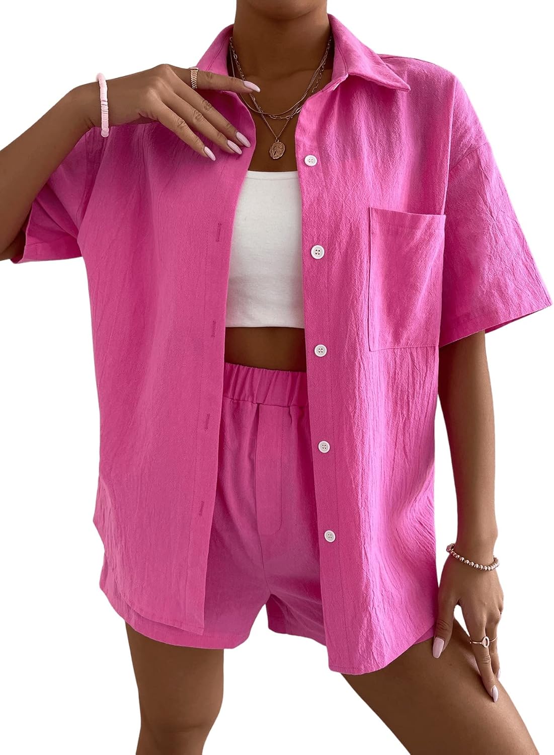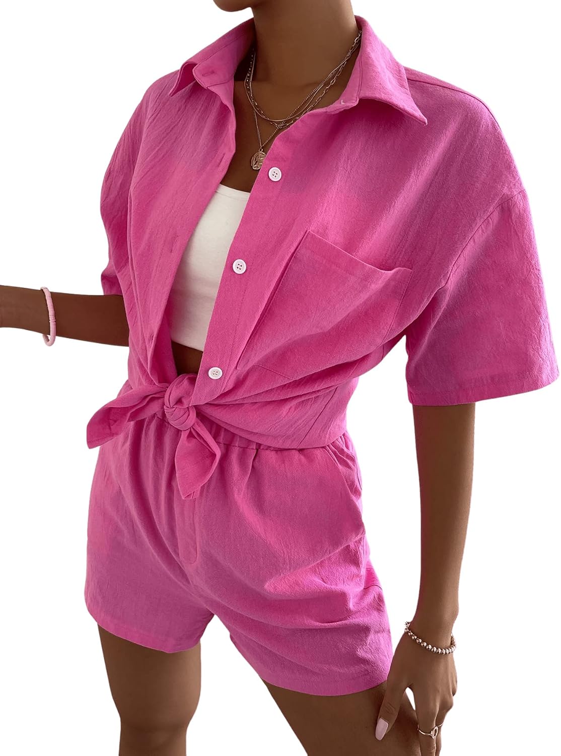 Material: 100% PolyesterUnique Design: Button down, short sleeve, pocket, collared shirt top, elastic waist shorts, solid colorEasy Match: Great to pair with sandals, high heels, shoes, boots, handbags, accessories for a chic lookOccasion: A good choice for hanging out, picnic, date, beach, vacation, summer party or casual etc.