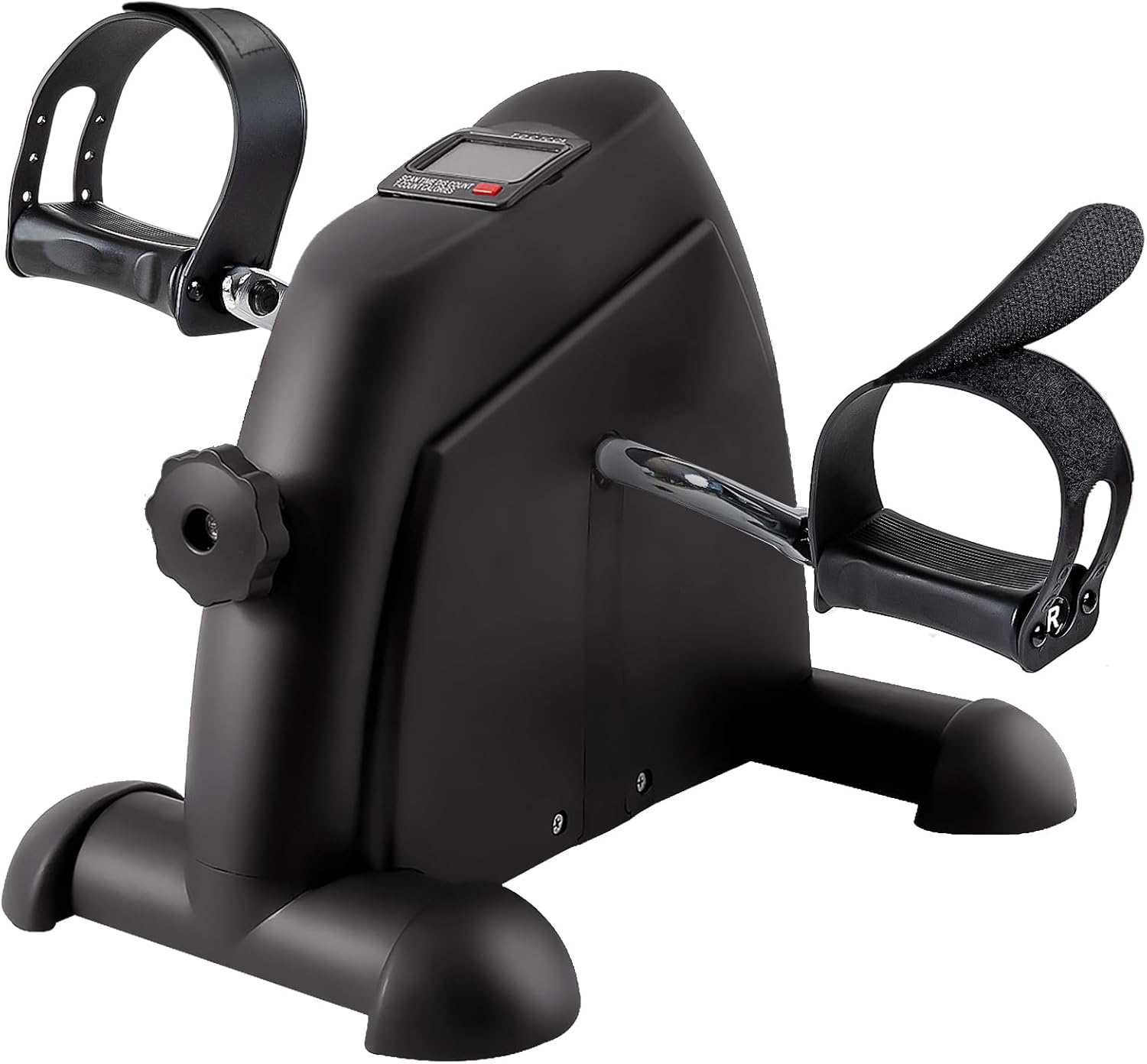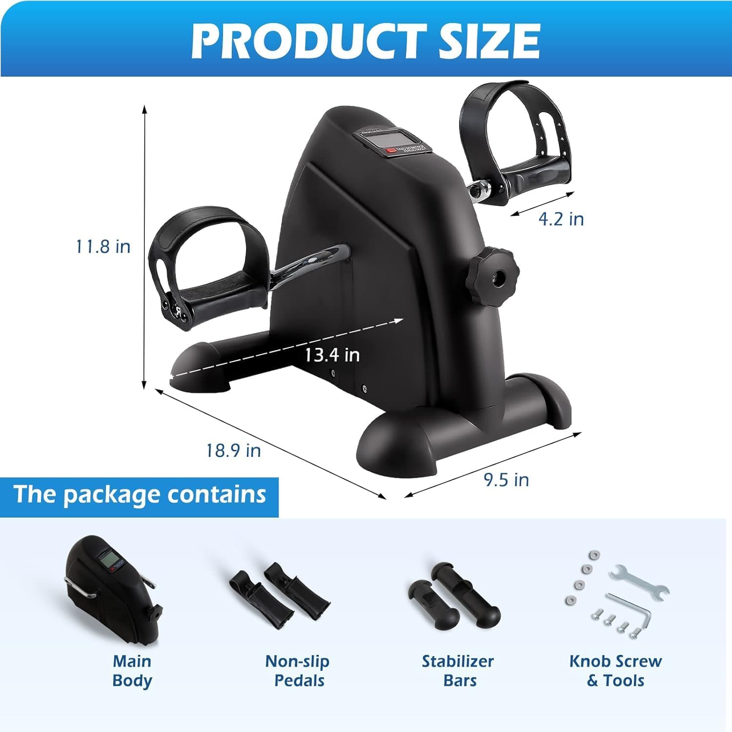 TABEKE Mini Exercise Bike for Arm/Leg Exercise, Mini Exercise Peddler with LCD Display; The quiet pedal exerciser is compact to easily fit under any desk for use in the office or at home and utilizes adjustable magnetic resistance for a customizable workout. The versatile exerciser features nonslip pedals with adjustable straps and can also be used on a tabletop for low impact arm exercise. Features: ✔ Can be used both on floor for leg exercise and on desk for arm exercise. ✔ Smooth and Quite Pedal Operation,easily fits under your desk. ✔ Non-slip Finger Grips and Slip-free Feet to prevent sliding and ensure safety. ✔ Easy to Read Screen to display time, distance, speed,Calories and RPM. ✔ Strengthen Tone + Increase Circulation + Improve Stamina Relieve Tension ✔ Strap is included to prevent slipping and sliding. ✔ Easy to Assemble, compact and portable Specifications: Net Weight: 9lbs Material: Steel + Plastic Dimensions:14.7”L x 11.4”H x 13.7”W Package Included: 1x Pedal Exercise 1x Instruction; 1x PVC Mat; 1x Fixing Strap