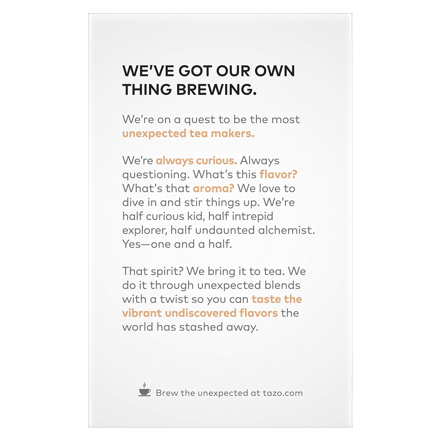 Tazo Passion Herbal Tea are iced tea bags infused with the refreshing flavors of hibiscus, orange peel, rose hips, and passion fruit that create a surprising tropical twist. There are 20 individually wrapped tea bags to preserve the freshness you love in every box! Add one Tazo unsweetened tea bag to a cup, top it up with hot water, and let it brew for 5 minutes to release all the bright freshness inside. You may also enjoy our range of other herbal teas, each with its own unique aroma and flavor. At Tazo, we’re serious tea lovers, and we believe in the joy of tea. We believe each cup of tea should add a little joy to your day, whether you’re drinking it as your morning tea or as an afternoon refreshment. That’s why we seek out the most delicious tea leaves, spices, and botanicals to craft exhilarating and unexpected blends that delight the senses. Our tea buyers travel to origin countries regularly to taste and select the world’s finest-quality teas and botanicals, and we carefully create our blends to craft complex flavors that complement each unique tea. Our tea experts are meticulous about blending because it lets us innovate taste profiles that are unlike those at any other tea brand. We’re always curious, always seeking, always questioning, and it’s the unpredictable, the unforeseen that drives us. They drive us away from our safe comfort zone in a commandeered golf cart or on the first flight we could find to who knows where or to the last stop of the subway, whichever gets us to points unexplored.