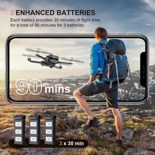 【𝐇𝐢𝐠𝐡-𝐭𝐞𝐜𝐡 𝐎𝐮𝐭𝐝𝐨𝐨𝐫 𝐏𝐞𝐫𝐟𝐨𝐫𝐦𝐚𝐧𝐜𝐞】: The super powerful 𝐛𝐫𝐮𝐬𝐡𝐥𝐞𝐬𝐬 𝐦𝐨𝐭𝐨𝐫𝐬 and 𝟑 𝐛𝐚𝐭𝐭𝐞𝐫𝐢𝐞𝐬 𝐟𝐨𝐫 𝟗𝟎 𝐦𝐢𝐧𝐮𝐭𝐞𝐬 ensure a stabler and longer flight and having enough time to compose the perfect pictures. The maximum distance for remote control reaches 𝟏𝐊𝐦/𝟑𝟐𝟖𝟎𝐟𝐭.