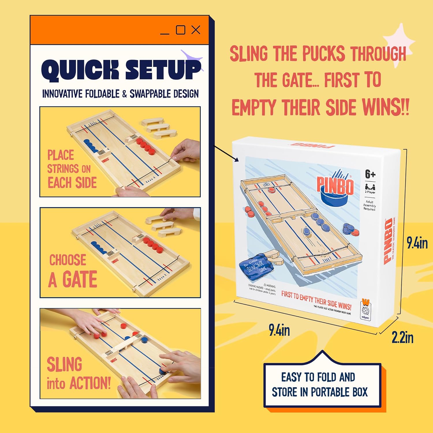 First player to empty their side wins! Pinbo is a fast paced action packed two player game with a unique foldable interchangeable design.