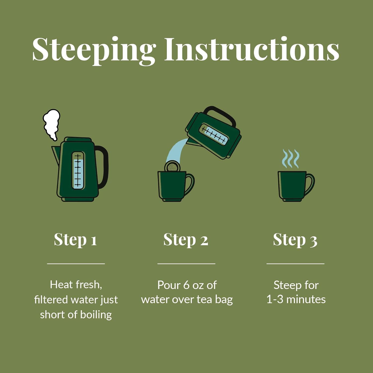 STEEPING INSTRUCTIONS: Steeping green tea is easy. Simply heat fresh, filtered water just short of boiling. Then pour 6 oz of water over tea and steep for 1-3 minutes (if using a tea bag) or 2-4 minutes (if using full-leaf tea.)