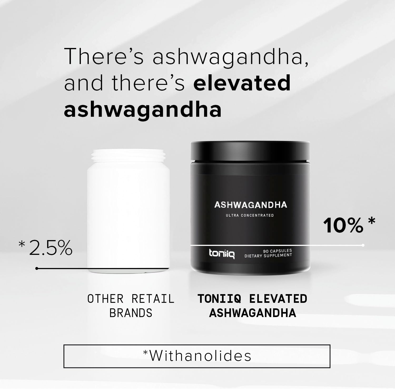 Meet the Next Generation of Ashwagandha – Toniiq Ashwagandha is a 20x concentrated extract, bringing some of the most potent levels of active constituents in the market. Our Ashwagandha extract contains an unprecedented 10% withanolides, the main compound that gives ashwagandha its bioactive properties. Most other ashwagandha products consist of non-concentrated ashwagandha powder, and contain less than 2.5% withanolides!