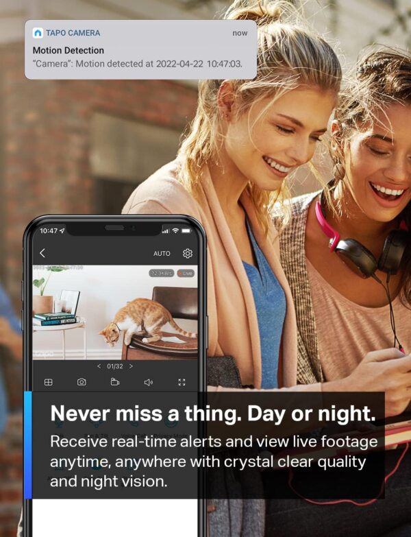 Protect your home with the Tapo C100 smart indoor security camera Wi-Fi. Featuring crystal-clear 1080P high-definition video, it captures every detail inside your home. Receive instant push notifications when motion, a person, or baby crying is detected from this baby camera monitor, all without additional fees. Monitor your home day and night with up to 30ft of night vision using the integrated IR sensor. Utilize the 2-way audio with a built-in siren to use as a pet camera with the phone app and deter intruders. Fully compatible with Amazon Alexa and Google Assistant, simply use voice commands to view the Tapo indoor security camera live stream on Echo Show or Google Chromecast with a screen. Store footage continuously on a microSD card up to 512 GB (not included) or subscribe to Tapo Care for cloud storage, offering a 30-day video history and additional benefits such as motion tracking and baby crying detection. [Before purchasing a microSD card, please check the TP-Link website FAQ to ensure compatibility with your device.]