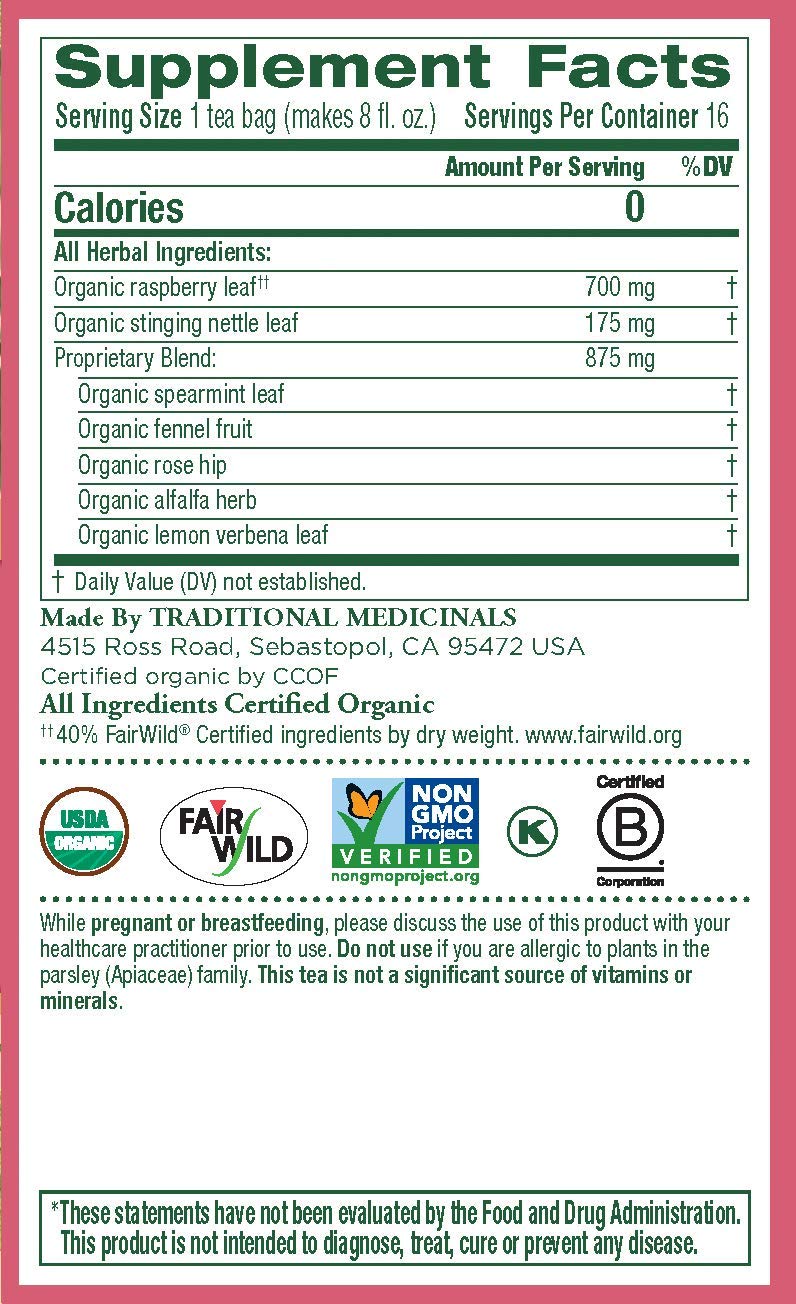 Organic raspberry leaf, Organic stinging nettle leaf, Organic spearmint leaf, Organic fennel fruit, Organic rose hip, Organic alfalfa herb, Organic lemon verbena leaf
