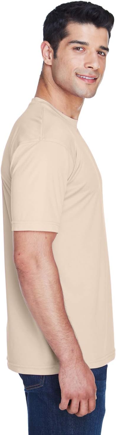 4 oz., 100% micro-polyester; Moisture-wicking; UPF 30+ protection; Athletic fit; Neck tape; 1/4inch topstitching