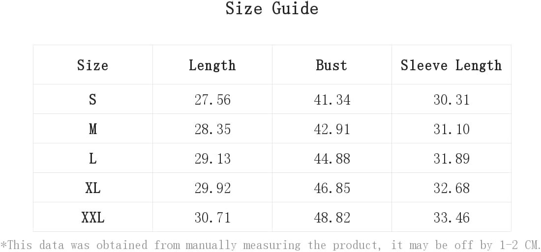 XXL:Bust:48.8IN,Length:30.7IN,Sleeve Length:33.5IN