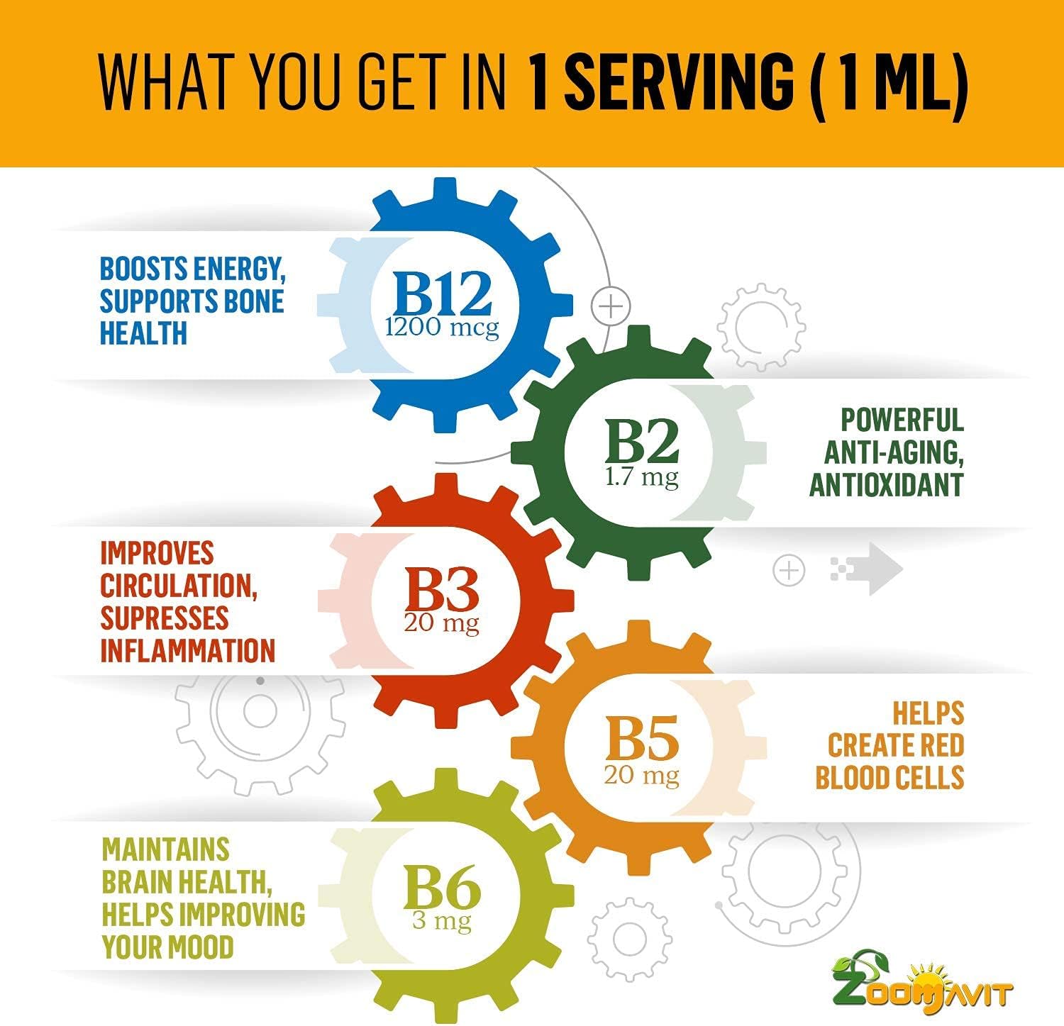 Fast absorption – A bottle of Zoomavit Liquid B12 contains 2 fluid oz (60 ml), which is a full 60-day supply. Shake well before use, fill the dropper (1 ml total serving) and hold it for 15-20 seconds before swallowing. This way it will go rapidly into your bloodstream and energize you.