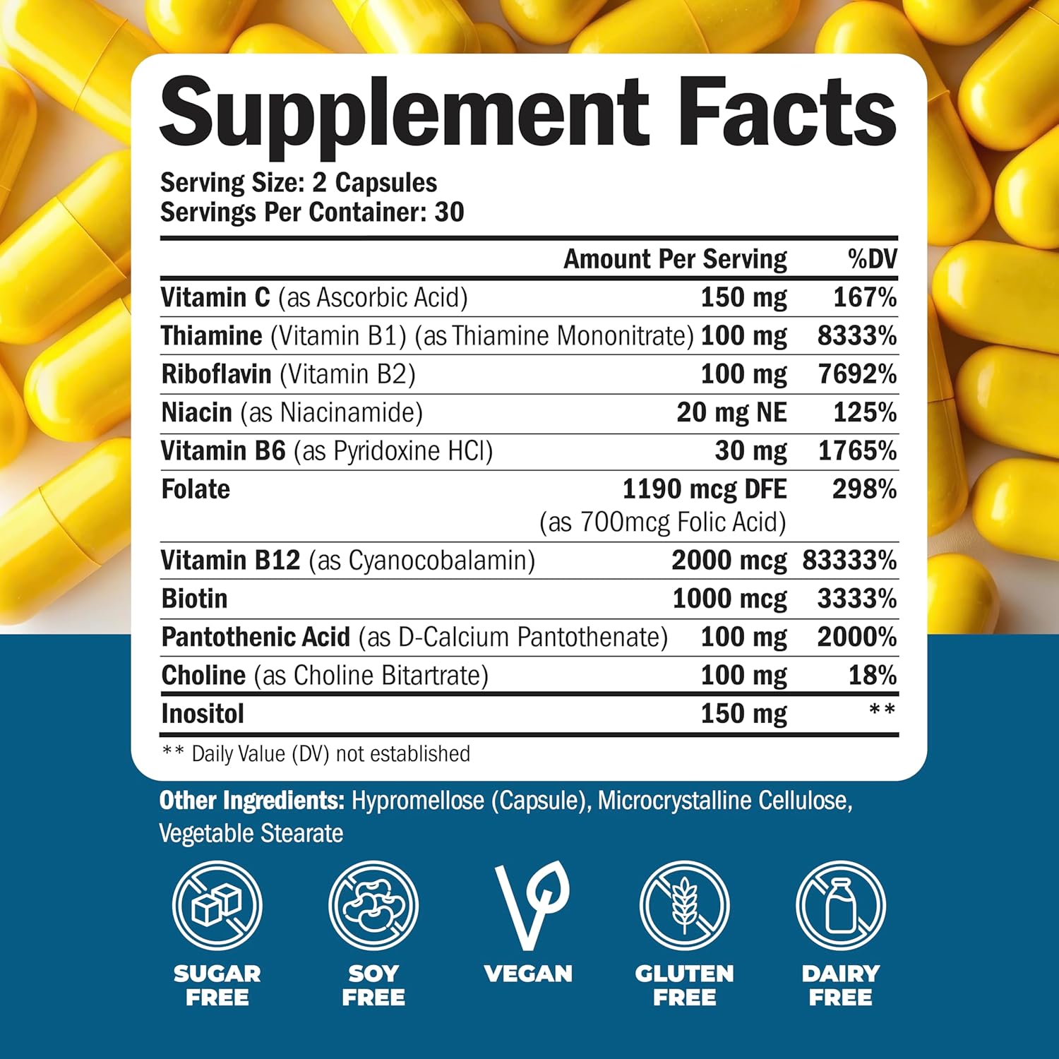 Vitamin B Complex with Vitamin C & Folic Acid (Folate) – 8 High Potency B Vitamins: B1, B2, B3, B5, B6, B7, Vitamin B12 + Biotin, Choline & Inositol. Aids Mood, Energy, Nervous System & Immune Support