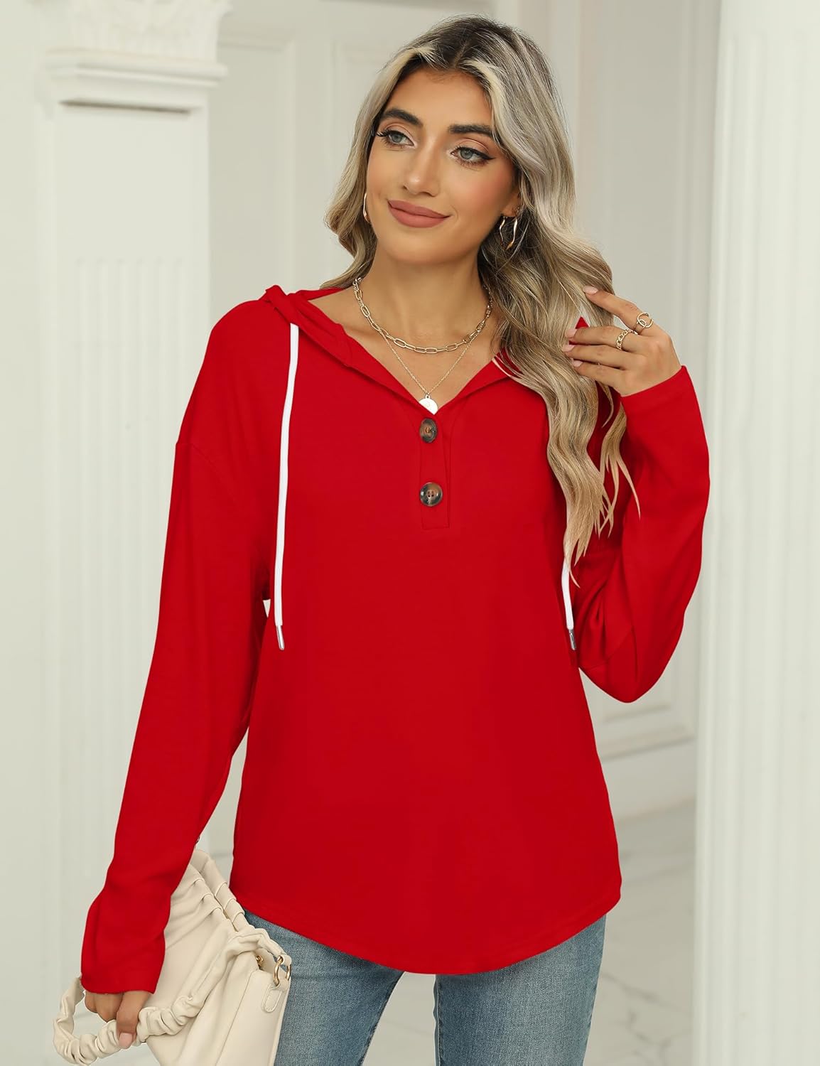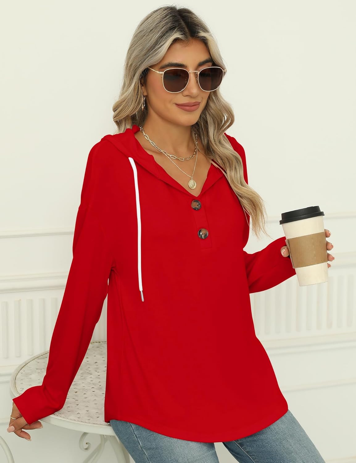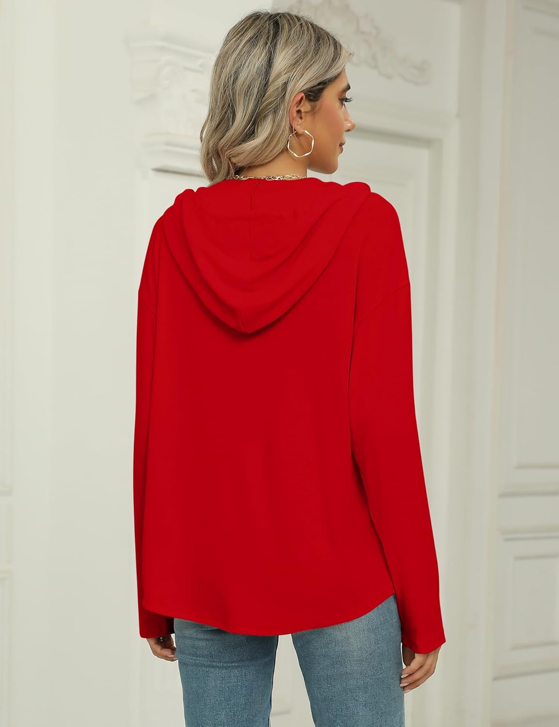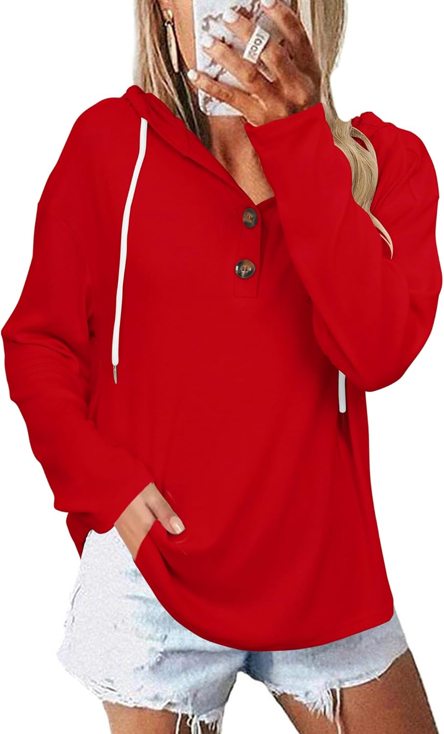 Our Sweatshirt is a classic pullover design with a long sleeve and a drawstring hood, but it also has some trendy details like a V-neck, button down and a slightly oversized fit, which is soft, cover a little tummy area and back area nicely and looser fitting tips will not tight around your waist.