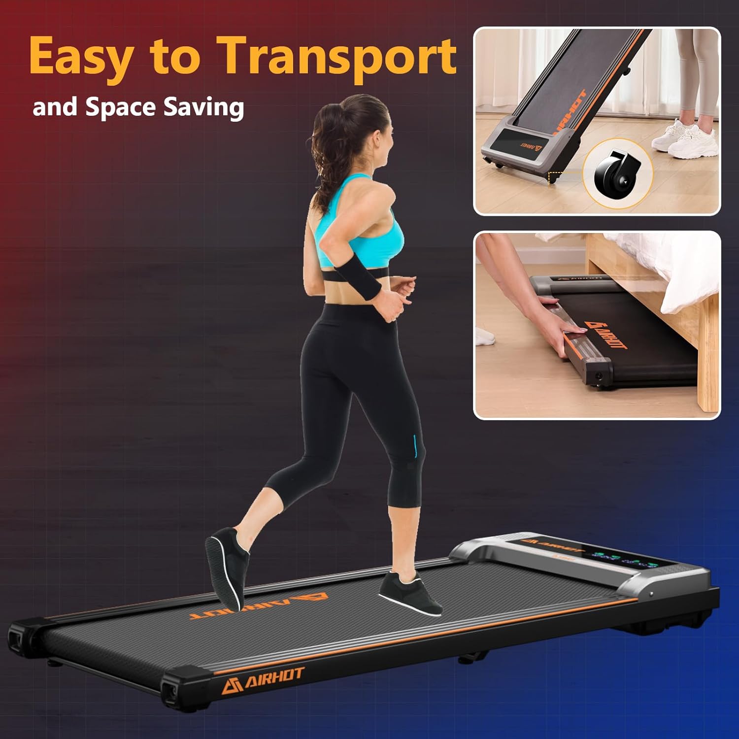【Compact & Convenient】Measuring just 4.9 inches thick, the AIRHOT Portable treadmill is compact and easy to store. It comes with built-in wheels, allowing you to effortlessly move and place it under your desk, bed, or sofa. Perfect for those with limited space, this treadmill seamlessly fits into any environment without compromising on functionality