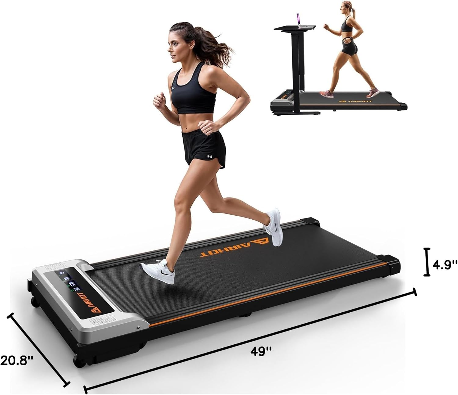 【Versatile & Spacious】The AIRHOT Walking pad offers a range of functions to cater to your fitness needs. Whether you prefer walking, working, jogging, or running, this treadmill has got you covered. The generous running surface measuring 41.3 x 16.5 inches provides ample space for your strides. Its versatile design allows you to use it in various scenarios, making it a perfect addition to your home gym or office space
