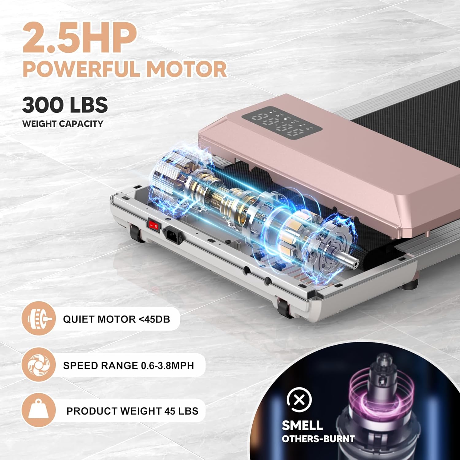 【2.5HP POWERFUL & SILENT MOTOR】Our under desk treadmill equipped with a powerful 2.5HP motor with a maximum weight capacity of 265 lbs, and offers a speed range of 0.6-3.8MPH for your free choice, whether you are jogging, working or running! Meanwhile, the quiet motor under 45DB will not affect your family’s rest. Our walking pad treadmill guarantees a quiet and secure running experience!