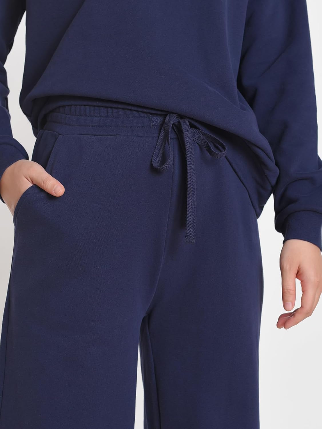 Consisting of long sleeve sweatshirt and wide leg cotton sweatpants, this petite sweatsuit sets is perfect for lounging around the house or running errands.