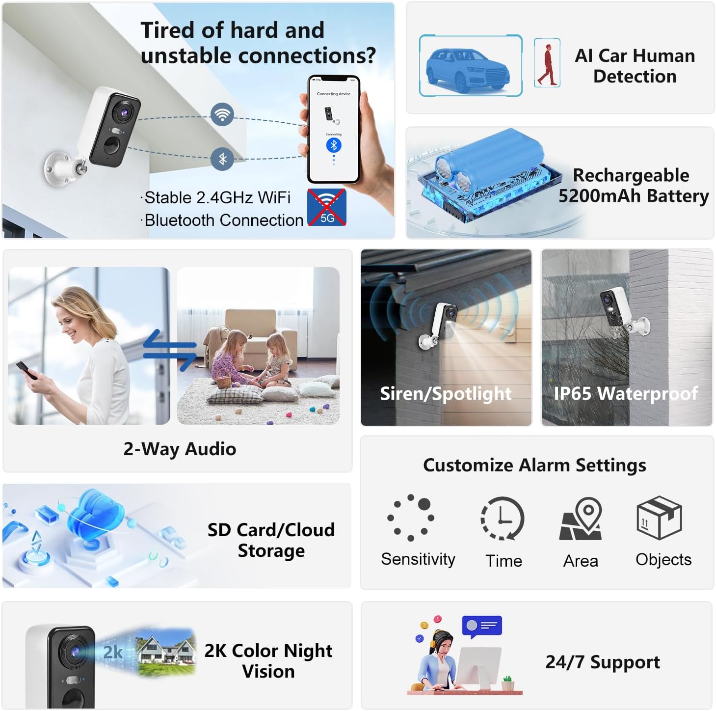 【100% Wireless Security Cam and Long-lasting Rechargeable Battery】The battery security cameras are totally wire-free, no network cable required. Built-in enhanced antennas, stably connect with 2.4GHz WiFi which has better penetration and wider Wi-Fi range. Fully charged battery for 8 hours to achieve up to 6 months standby, greatly avoiding frequent battery charging. IP65 weatherproof design makes it easy to place this wireless indoor and outdoor security camera anywhere. (Not support 5g Wi-Fi)