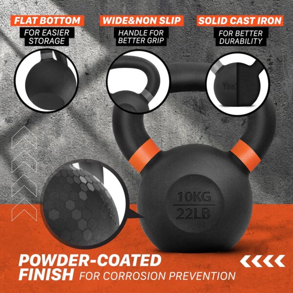 SOLID CAST IRON: Strength training kettlebells are constructed from solid cast iron with no welds, weak spots, or seams; The powder coating prevents corrosion and provides a better grip, eliminating the slipping common with glossy finishes