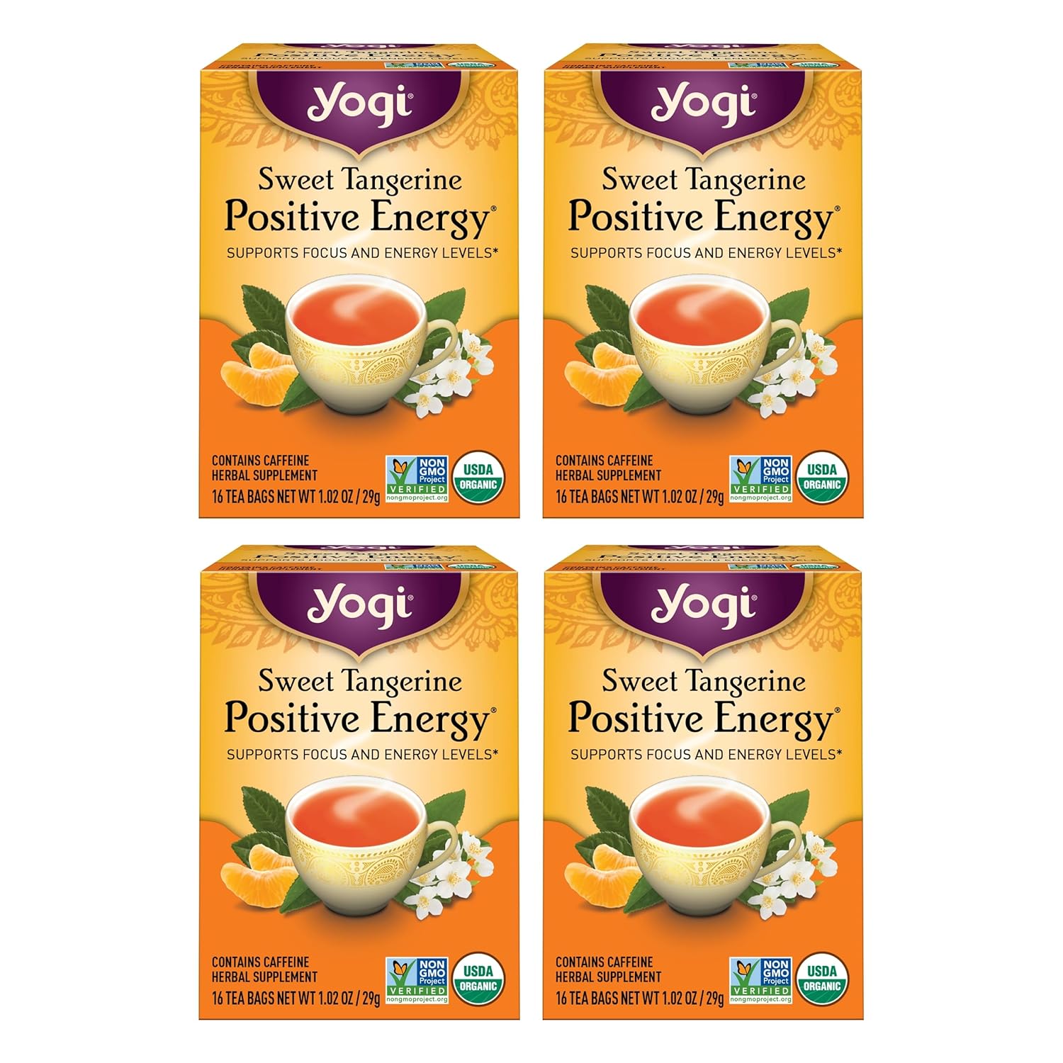 Tangerine Energy Tea: Yogi Sweet Tangerine Positive Energy tea combines Ashwagandha, an herb traditionally used to uplift the spirit, with an invigorating blend of Black Tea and Yerba Maté Leaf to help support energy