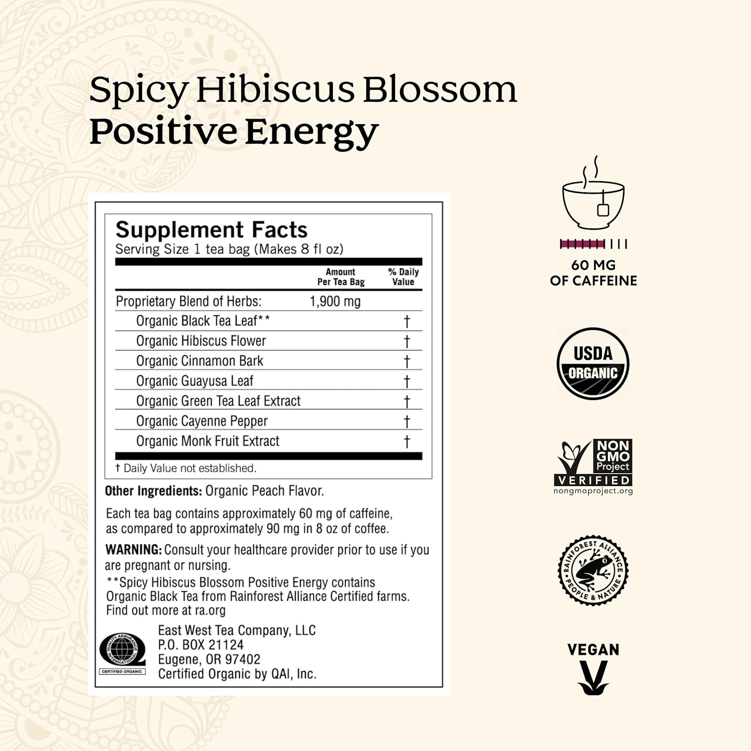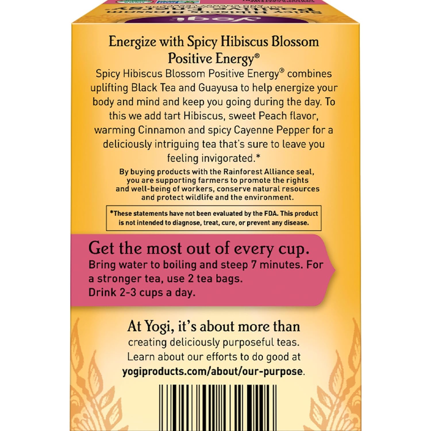Positive Energy Tea: Yogi Spicy Hibiscus Blossom Positive Energy tea combines uplifting Organic Black Tea with Organic Guayusa Leaf and Organic Green Tea Leaf Extract to help energize your body and mind