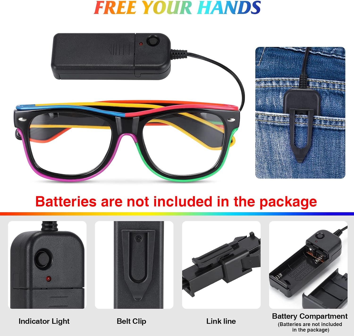 Work with a Battery Pack: This neon glasses for glow party come with a battery pack that requires two AA batteries. With a 39″ wire, it’s easy to hide the pack in your pocket, attach it to your clothing, or clip it onto your belt using the built-in clip. Stay powered and enjoy mesmerizing light effects on the go