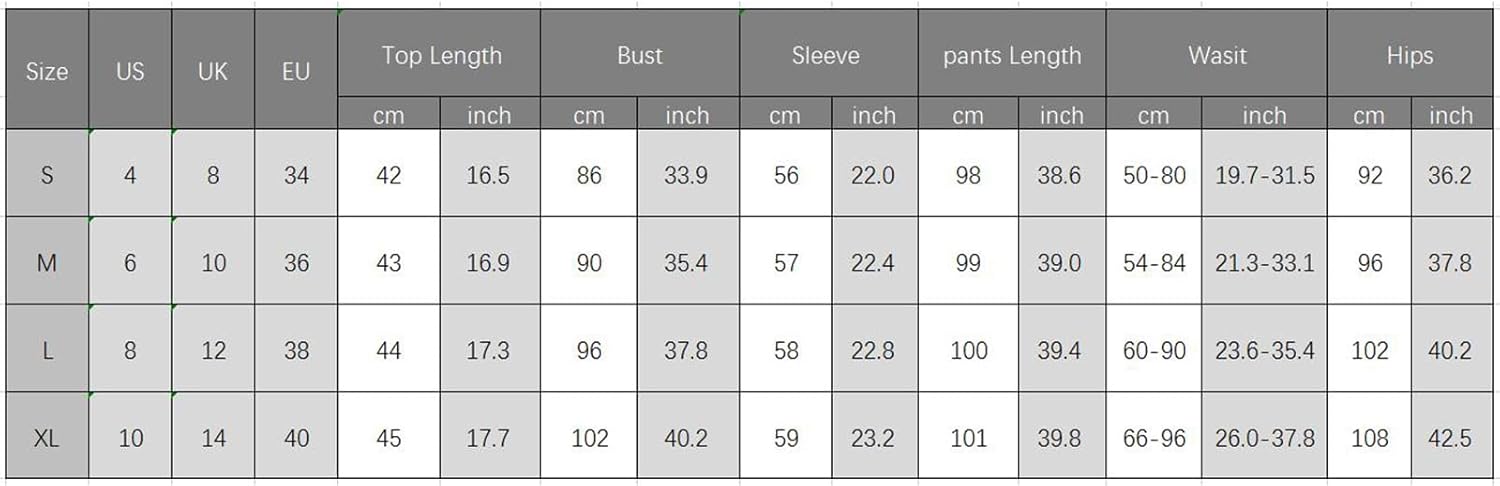 XL Tops Length: 20.08 Bust: 37.01 Sleeve: 24.02 Shoulder: 14.17 Pants Length: 40.16 Hip: 38.58 Waist: 32.28