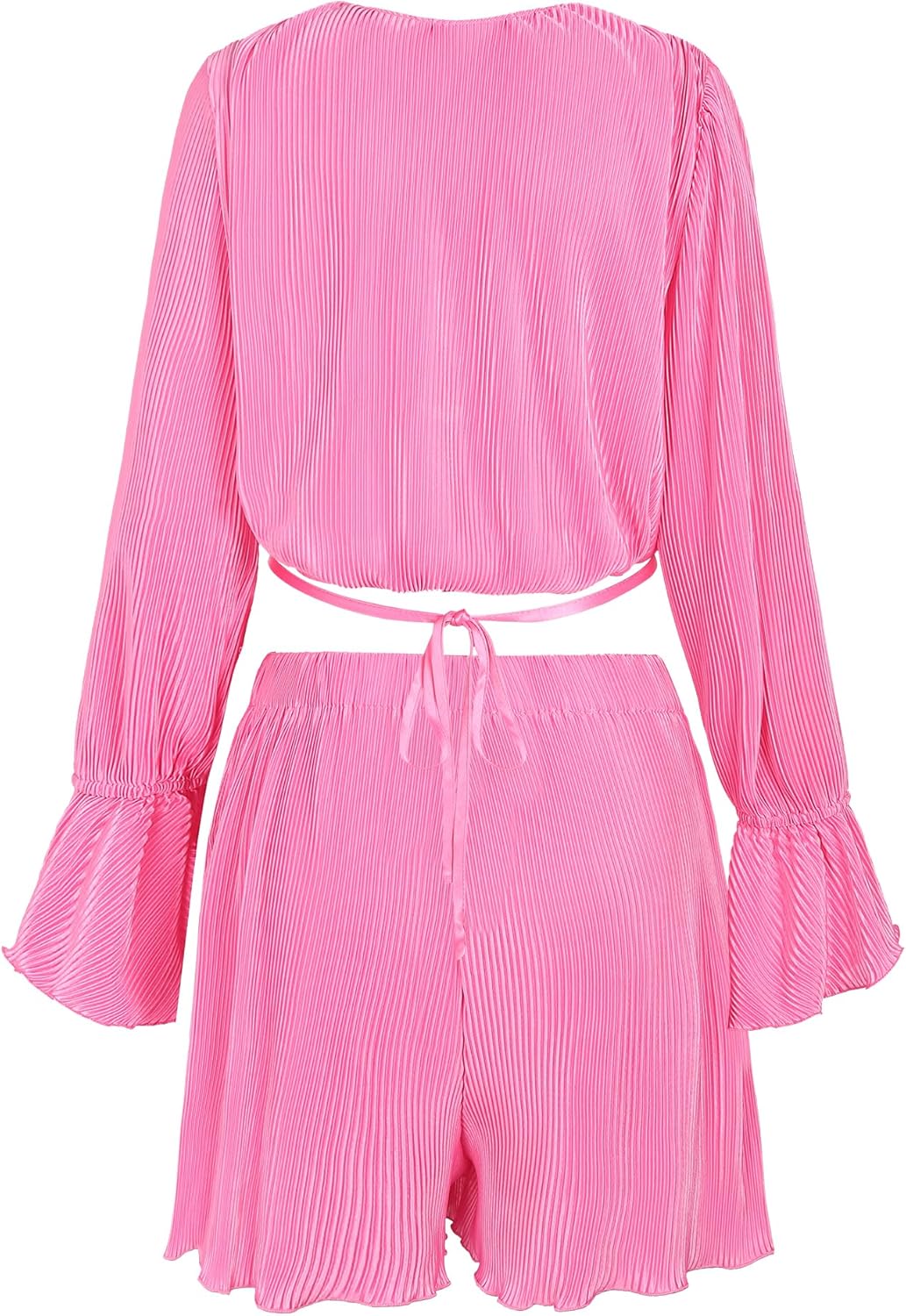 Features: Wrap shirts and pants two piece sets, plisse, deep v neck, long sleeves, criss cross front, self tie crop blouse, loose fit shorts, high elastic waistband.