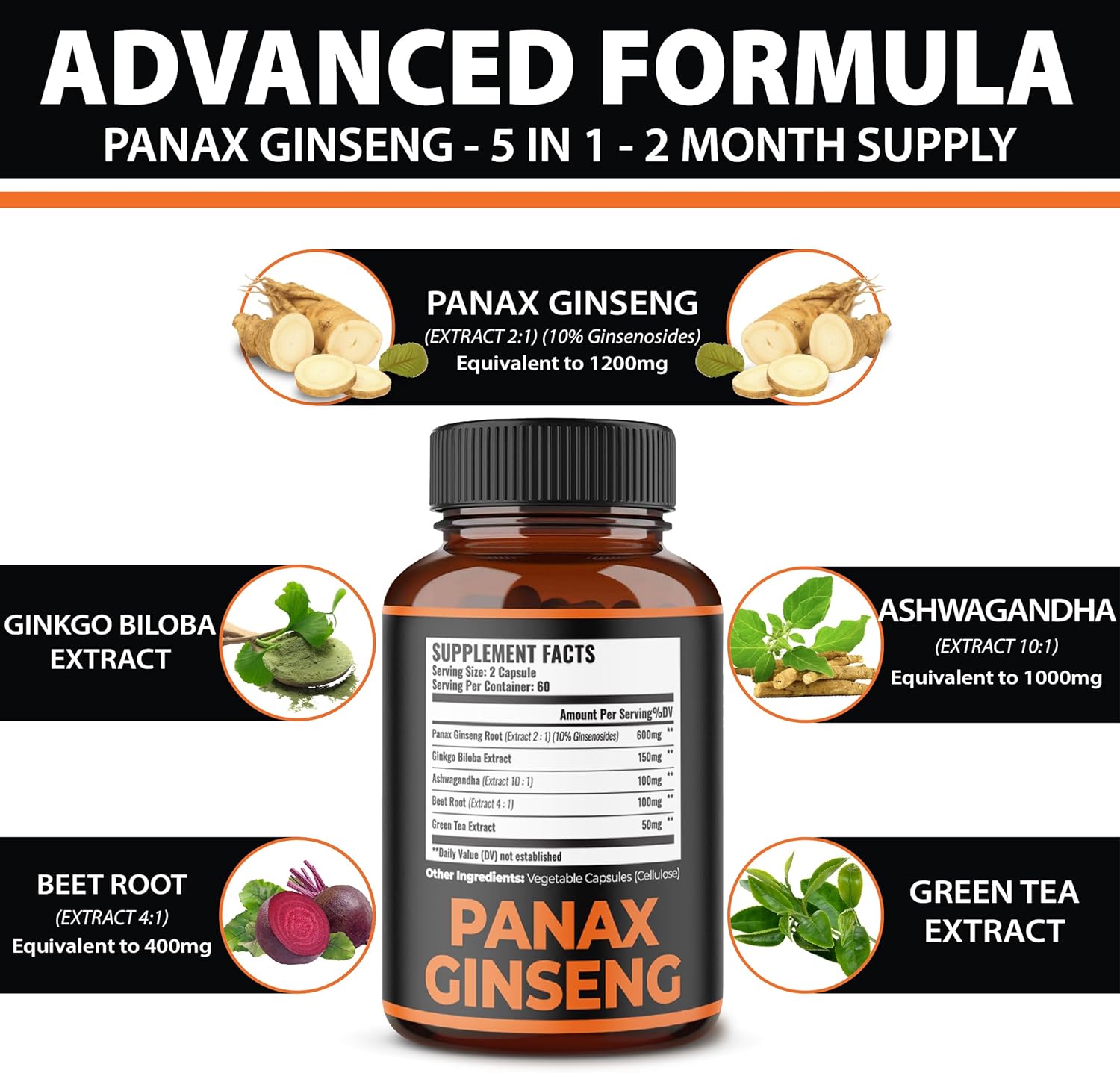 5-in-1 Special Formula: Ginseng supplements feature an array of pure ingredients, including Panax Ginseng, Gingko Biloba, Ashwagandha, Beetroot and Green Tea.